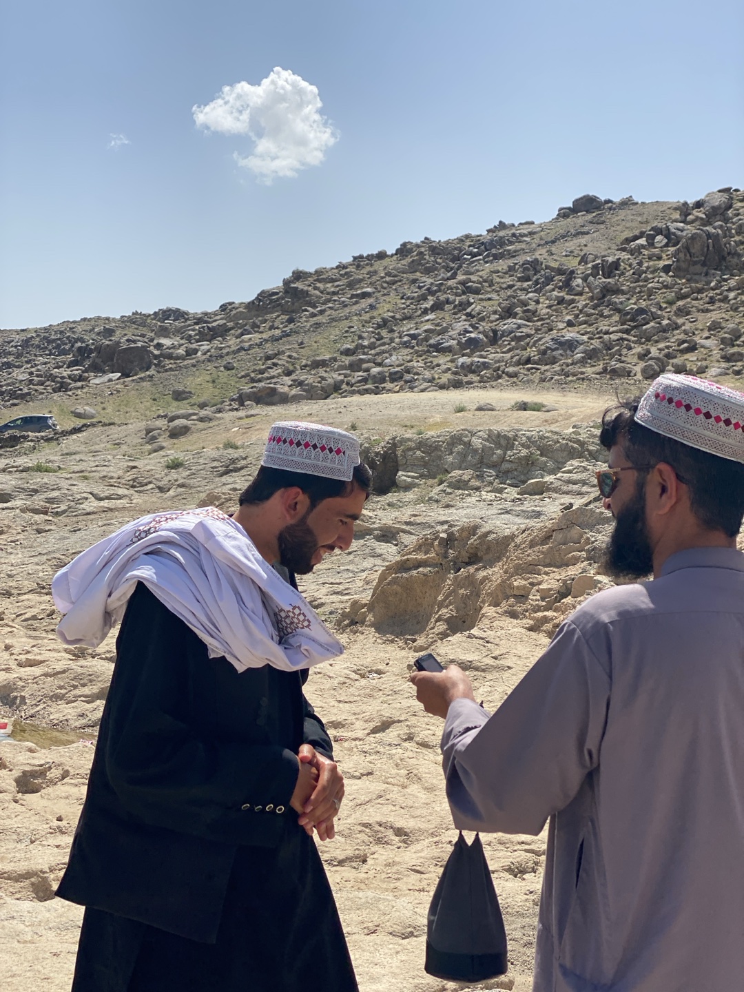The image depicts two men in a rocky, arid landscape, possibly in Abdol Ahadkhan Kariz, Afghanistan. Both men are wearing traditional caps with a red and white pattern. The man on the left is wearing…read more