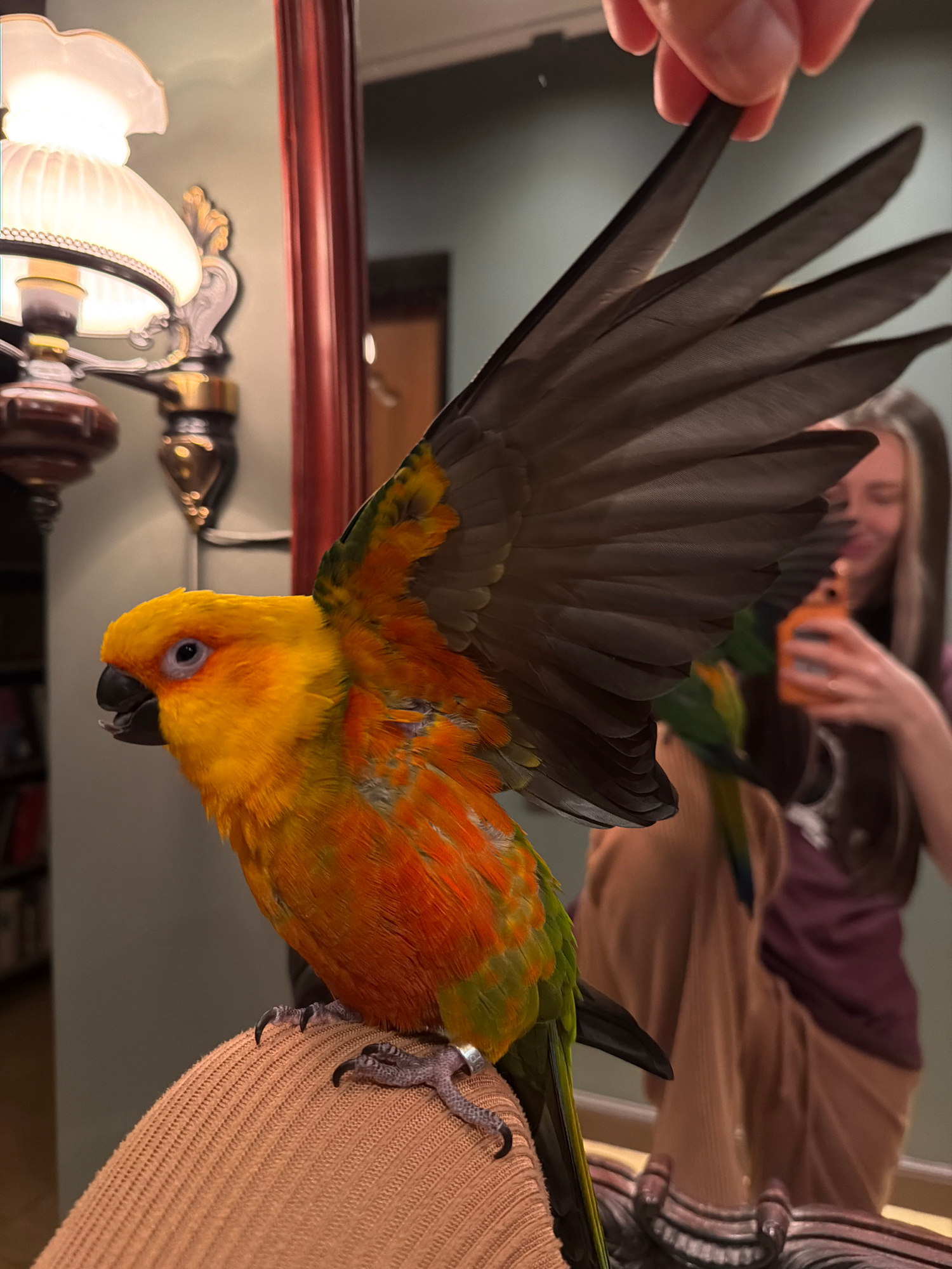 A vividly colored Sun Conure parrot is prominently featured, exhibiting yellow on its head and orange on its chest, with green wing tips and dark grey flight feathers. The bird is positioned clinging…read more