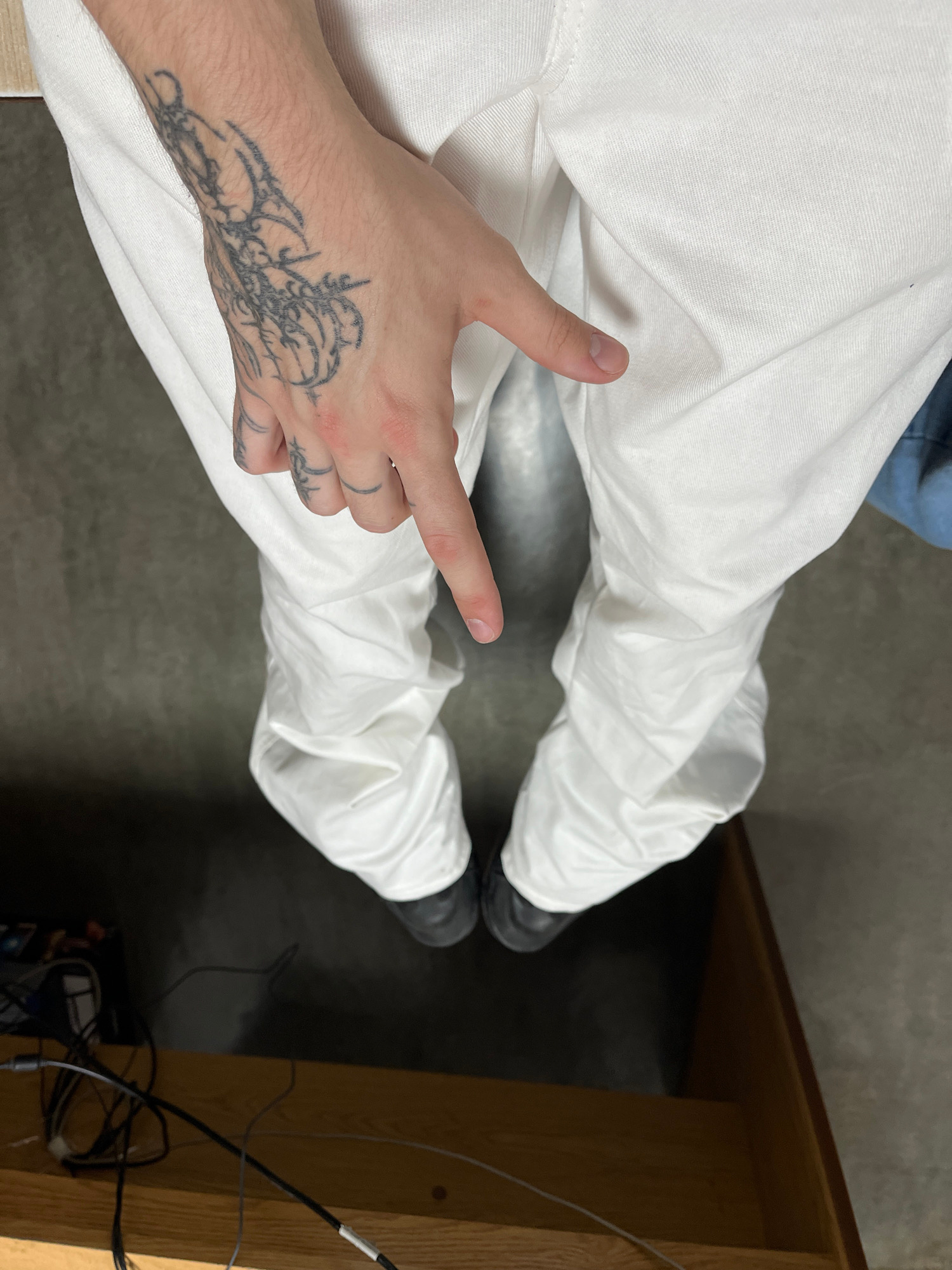 The scene, likely indoors, presents a top-down view of a person clad in white overalls and black shoes. The subject's left hand, adorned with distinctive tattoo art, is prominently featured. The envir…read more