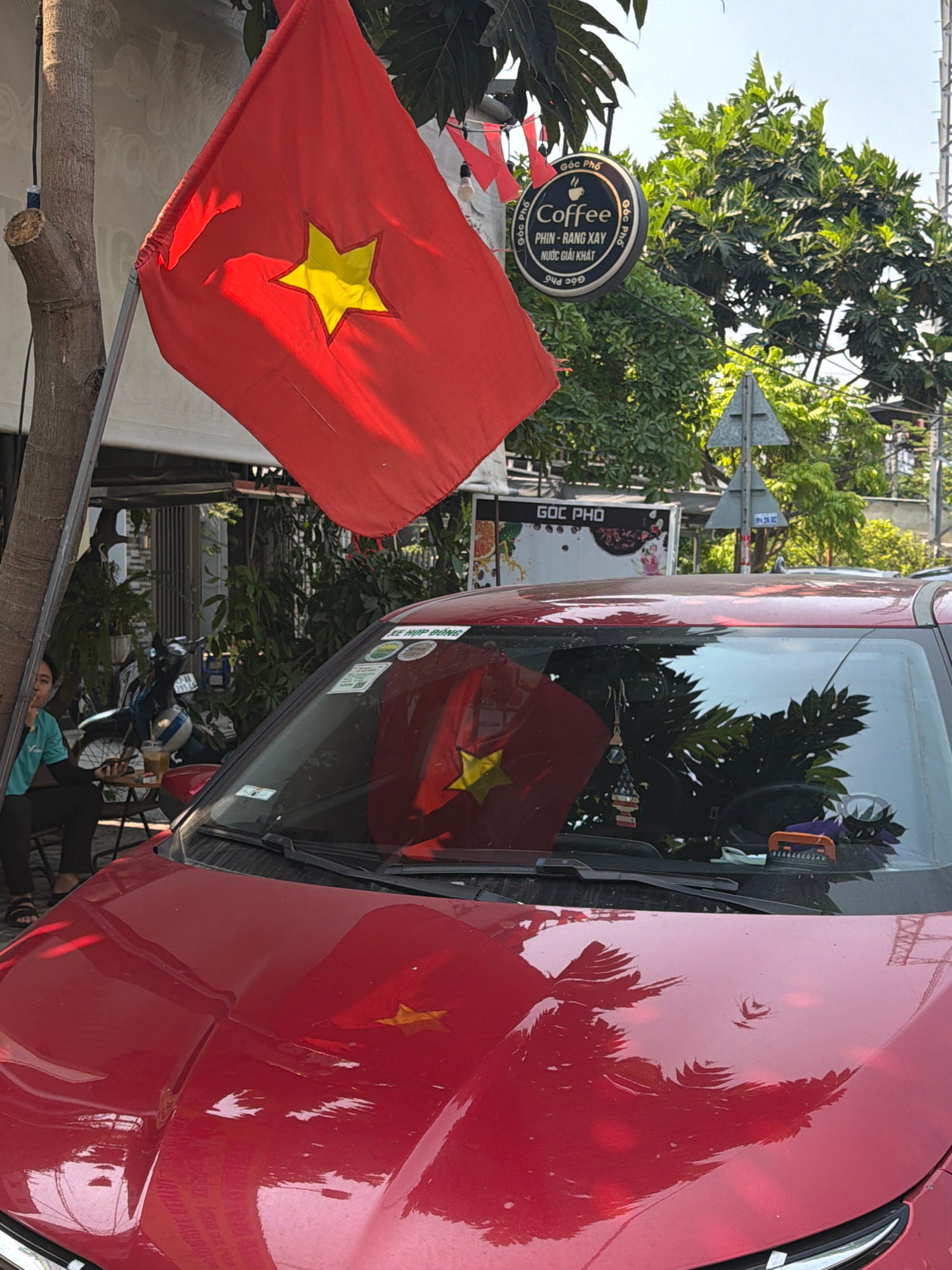 A tilted, medium-shot photo captures a street scene in Đà Nẵng, Vietnam. The focal point is a red car with a Vietnamese flag’s reflection on its hood and windscreen. A real Vietnamese flag flies promi…read more