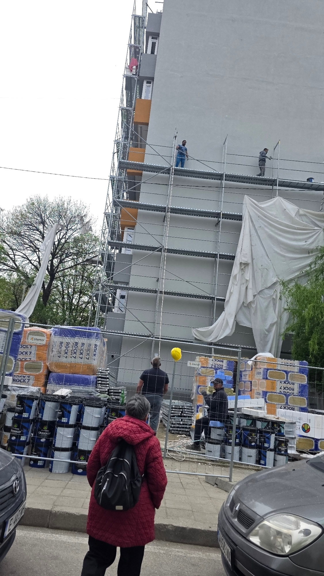The image depicts a construction site scene in an urban area, possibly Blagoevgrad, Bulgaria. A tall building is undergoing renovation or construction, as indicated by the scaffolding erected against…read more