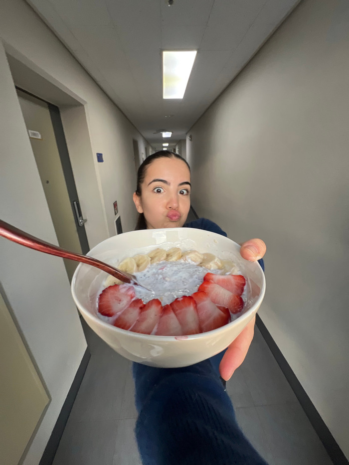 The image displays an individual, identified as female, extending a bowl containing food towards the viewer. The scene is a narrow, illuminated hallway, consistent with a residential or dormitory buil…read more