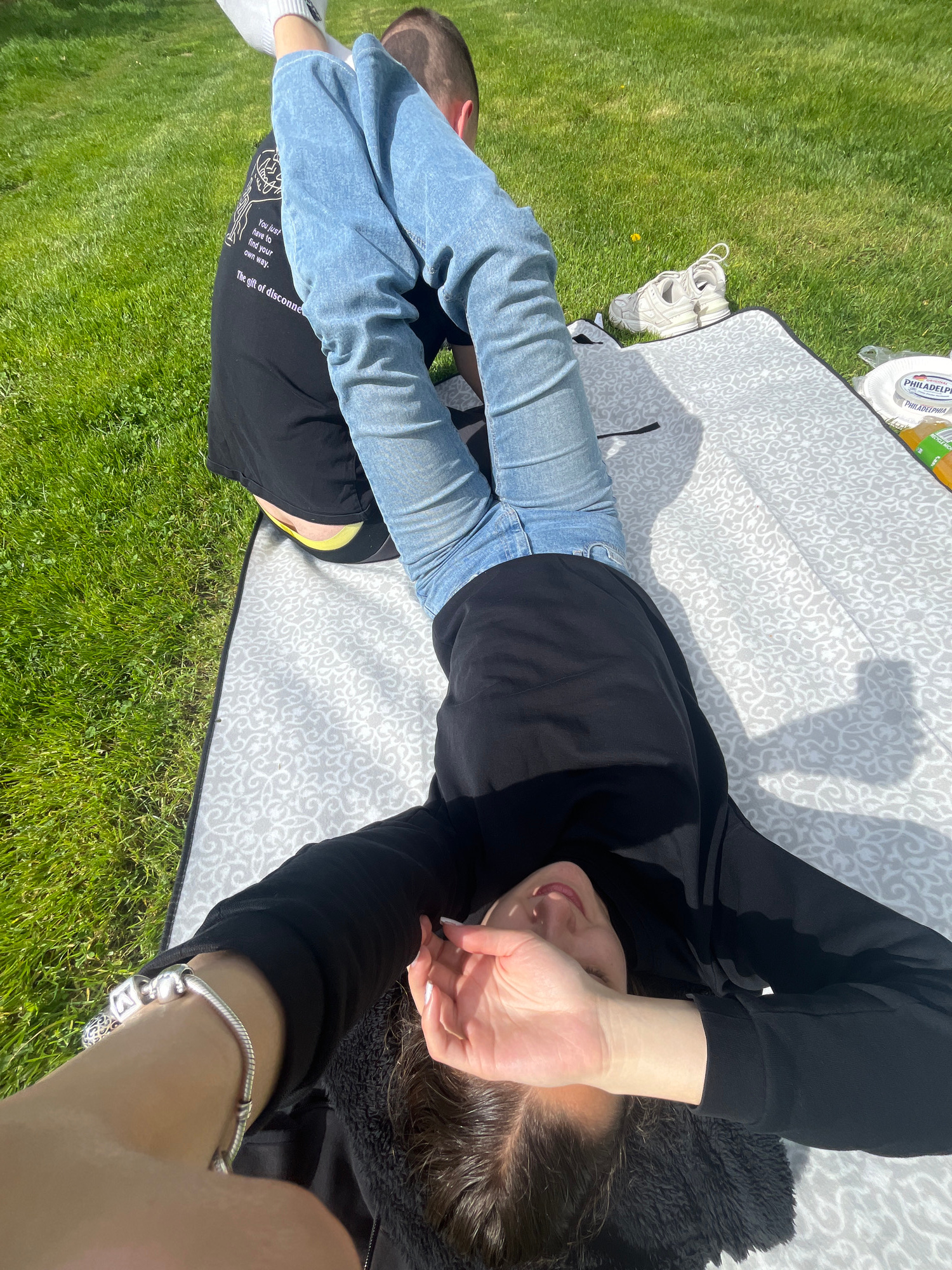 This overhead outdoor photograph captures two individuals relaxing on a sunny day in a grassy area, likely a park, in Saarbrücken, Germany. The main subject is lying on their back on a grey and white…read more