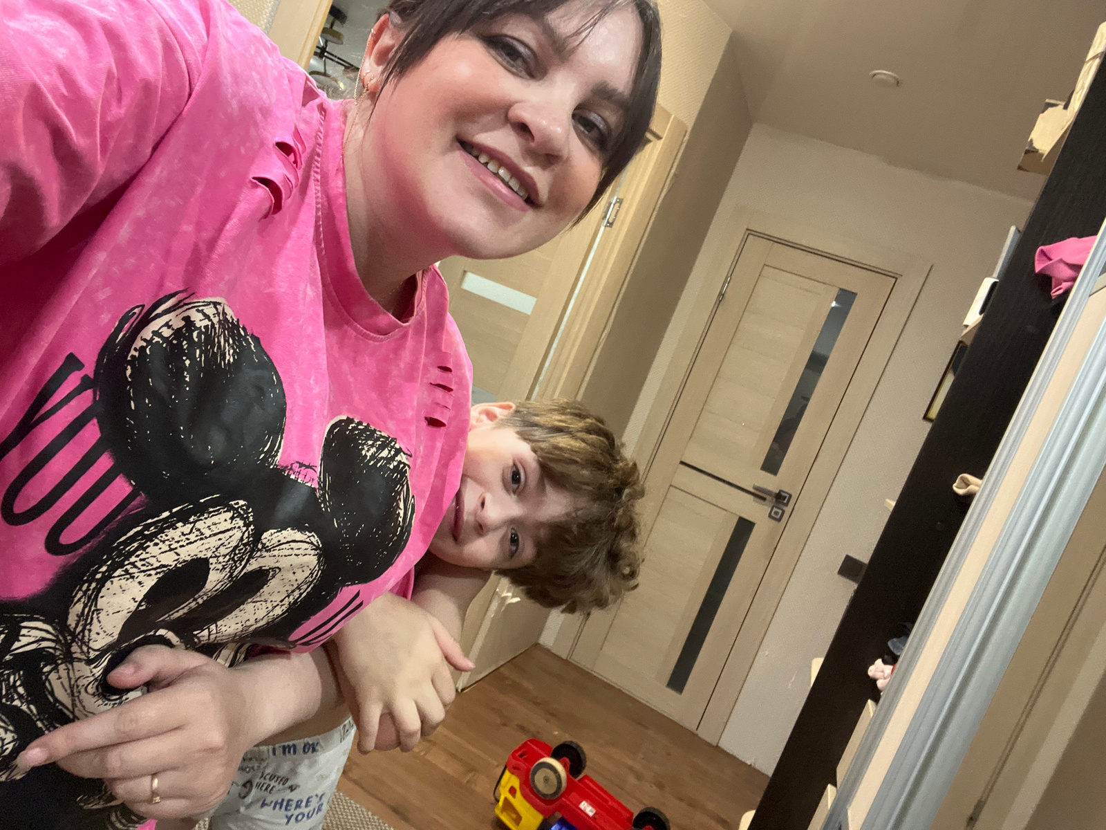 A selfie-style, indoor shot features a woman and a child. The woman, positioned in the foreground, is wearing a pink sweatshirt with a Mickey Mouse design. Her dark hair frames her face, and she is smiling. Behind her, a child with brown, curly hair is visible, also looking towards the camera. The background includes a wooden floor, a toy truck, and doors. The location is possibly in Noviy, Russia, as specified in the prompt. The image's perspective suggests it was taken from a high angle. | Open Wire