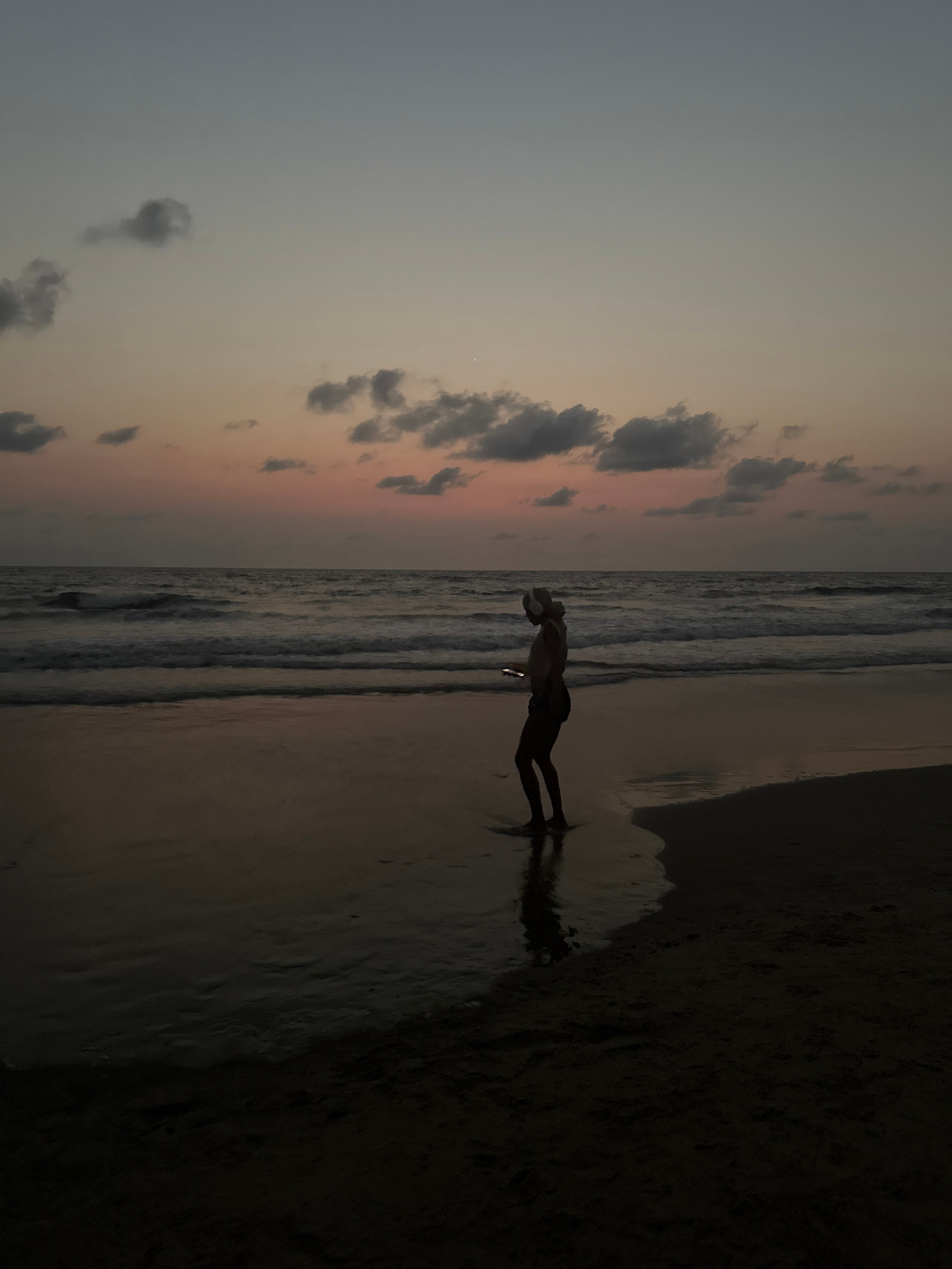 The image depicts a beach scene in Arambol, India, during dusk or dawn. The sky is a gradient of light grey, pink, and orange, with scattered clouds. The sea is in the middle of the frame, with small…read more