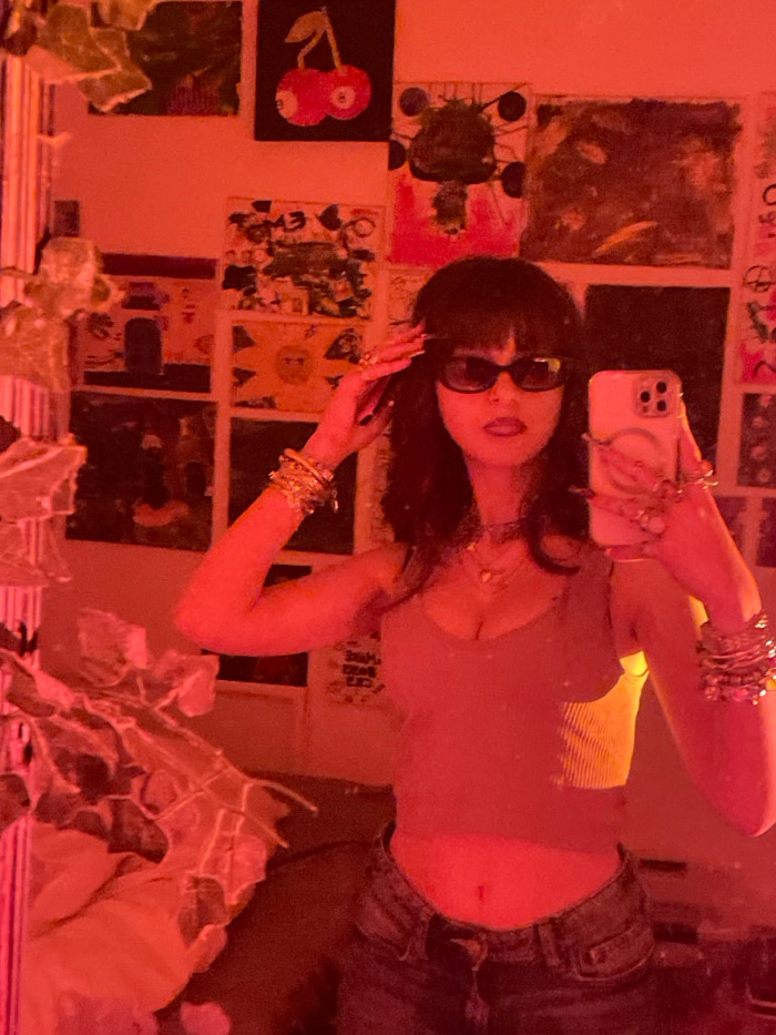 The image, rotated 90 degrees clockwise, depicts a young woman taking a mirror selfie. She has dark hair with bangs, wears large dark sunglasses, and her lips are slightly parted. She is dressed in a…read more