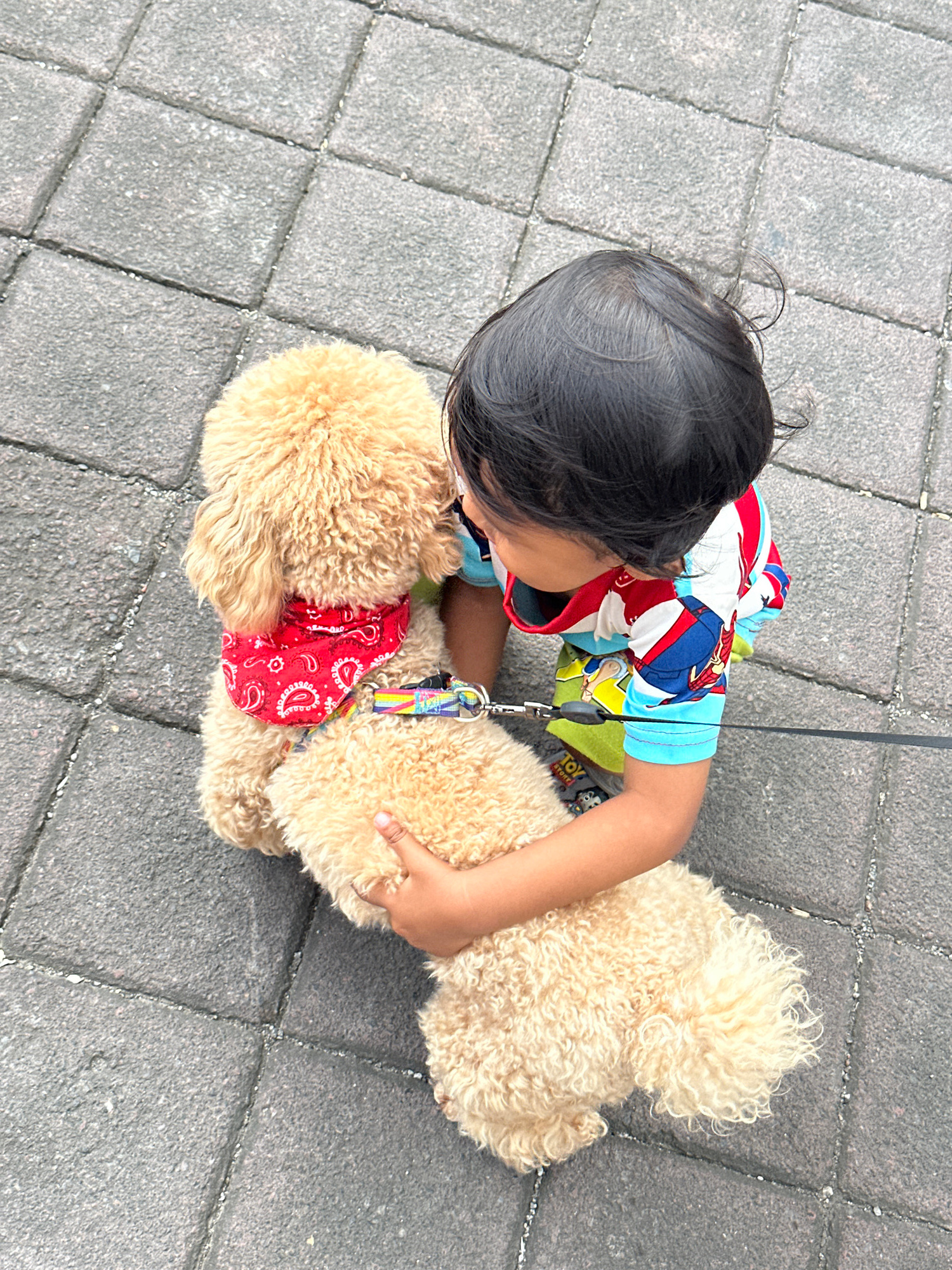 A high-angle forensic shot depicts a child embracing a small dog on a paved surface in Buduk, Indonesia. The child, visible from the back and side, has short dark hair and wears a short-sleeved t-shir…read more
