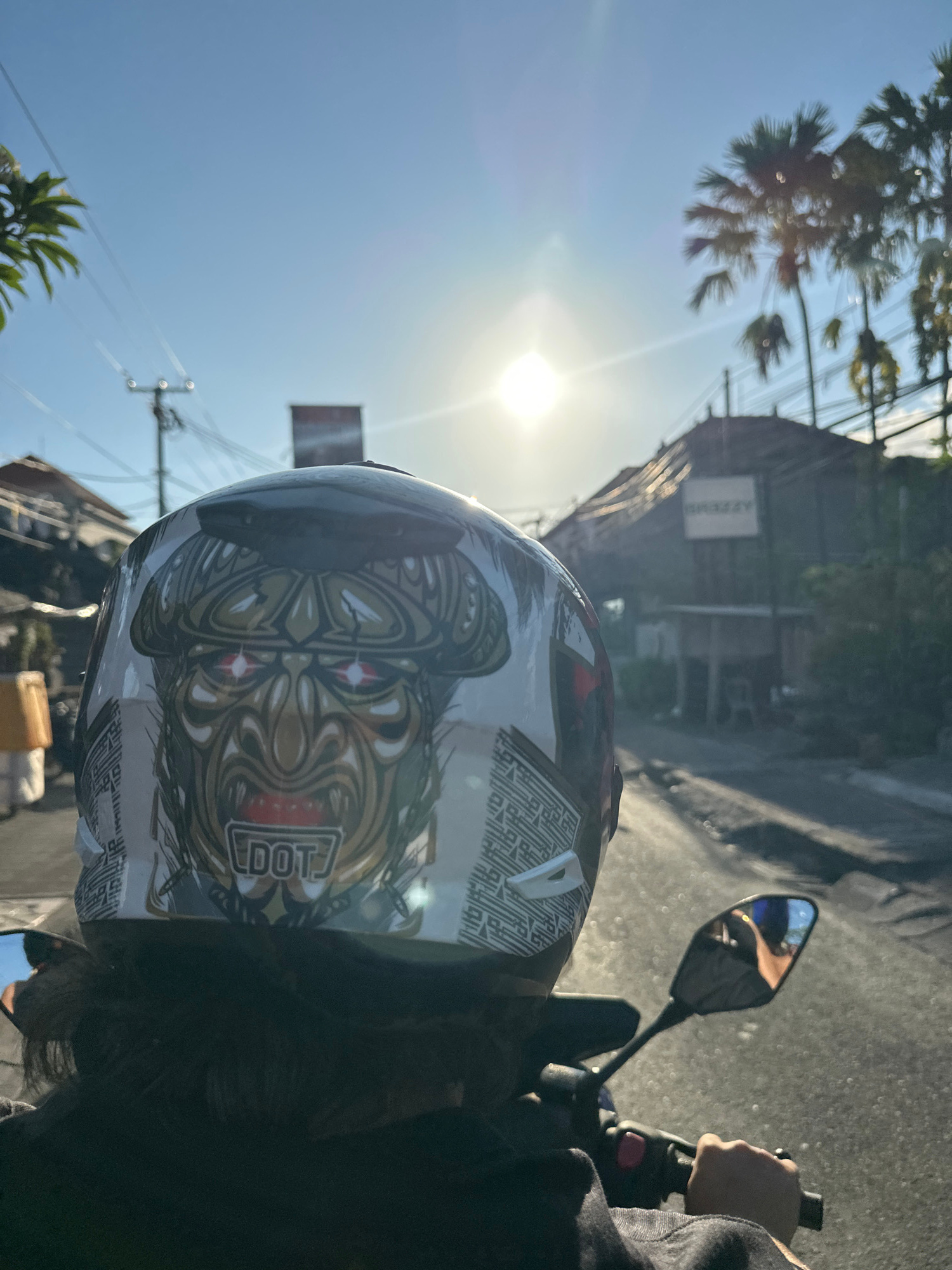 The image, taken from a first-person perspective, shows a person riding a motorcycle in North Kuta, Indonesia. The rider is wearing a motorcycle helmet with intricate designs and the letters "DOT" visβ¦read more