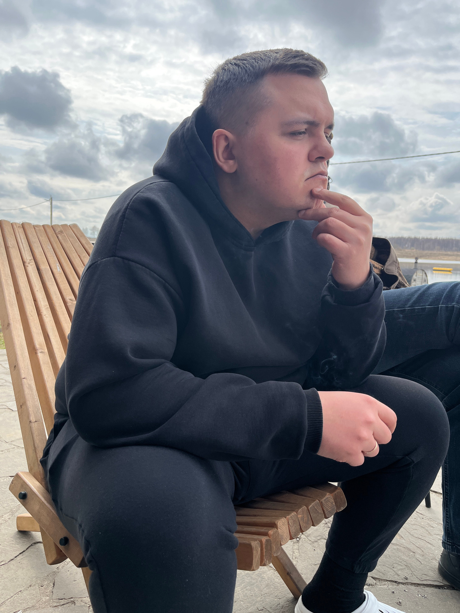 A young, light-skinned man in a black hoodie and sweatpants sits in a slatted wooden chair. He is holding a cigarette to his mouth, and smoke is visible. Part of another person wearing black jeans andβ¦read more