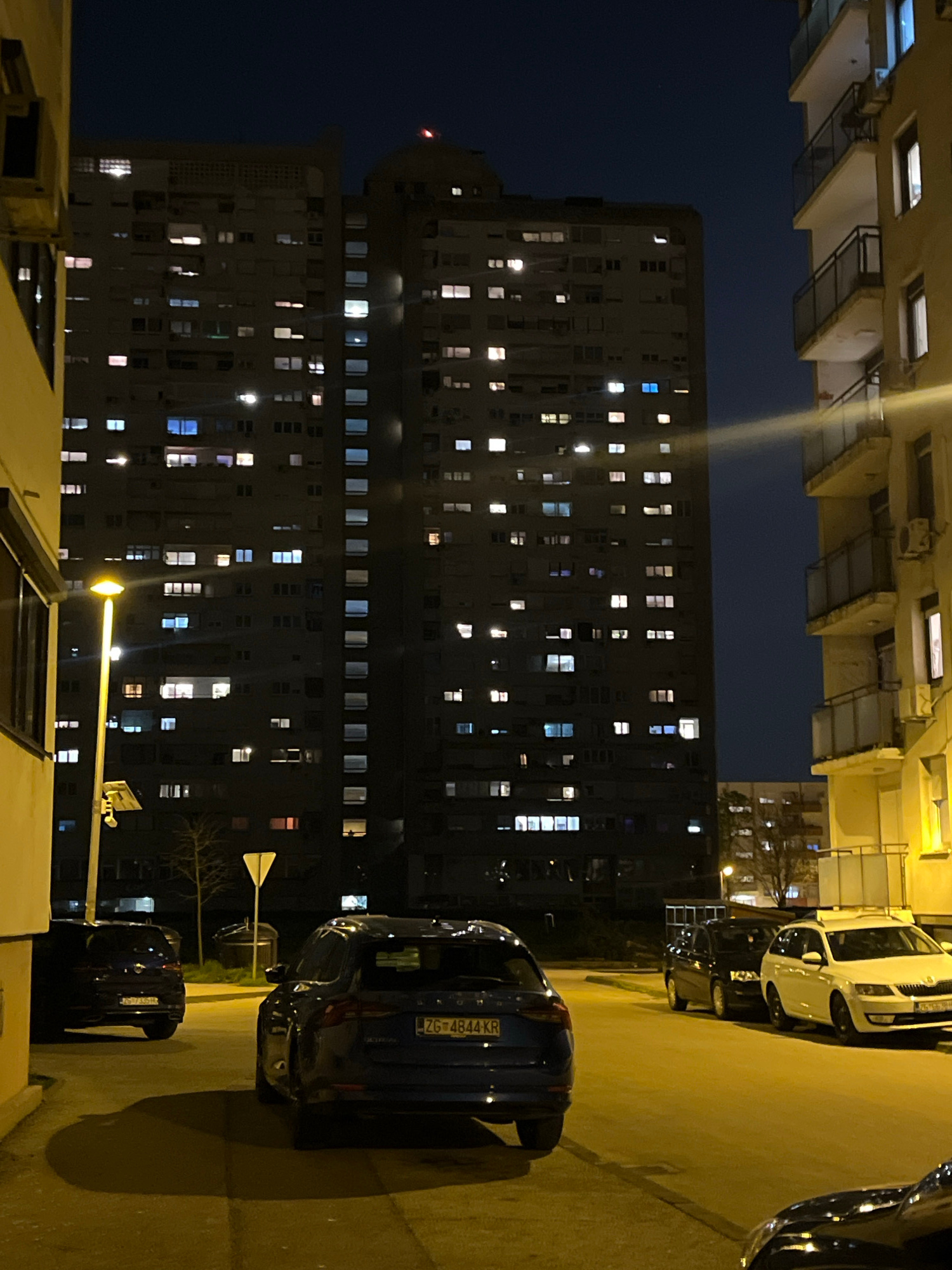 The image depicts a night scene in what appears to be a residential area within the City of Zagreb, Croatia. A high-rise apartment building dominates the frame, its many windows glowing with artificia…read more