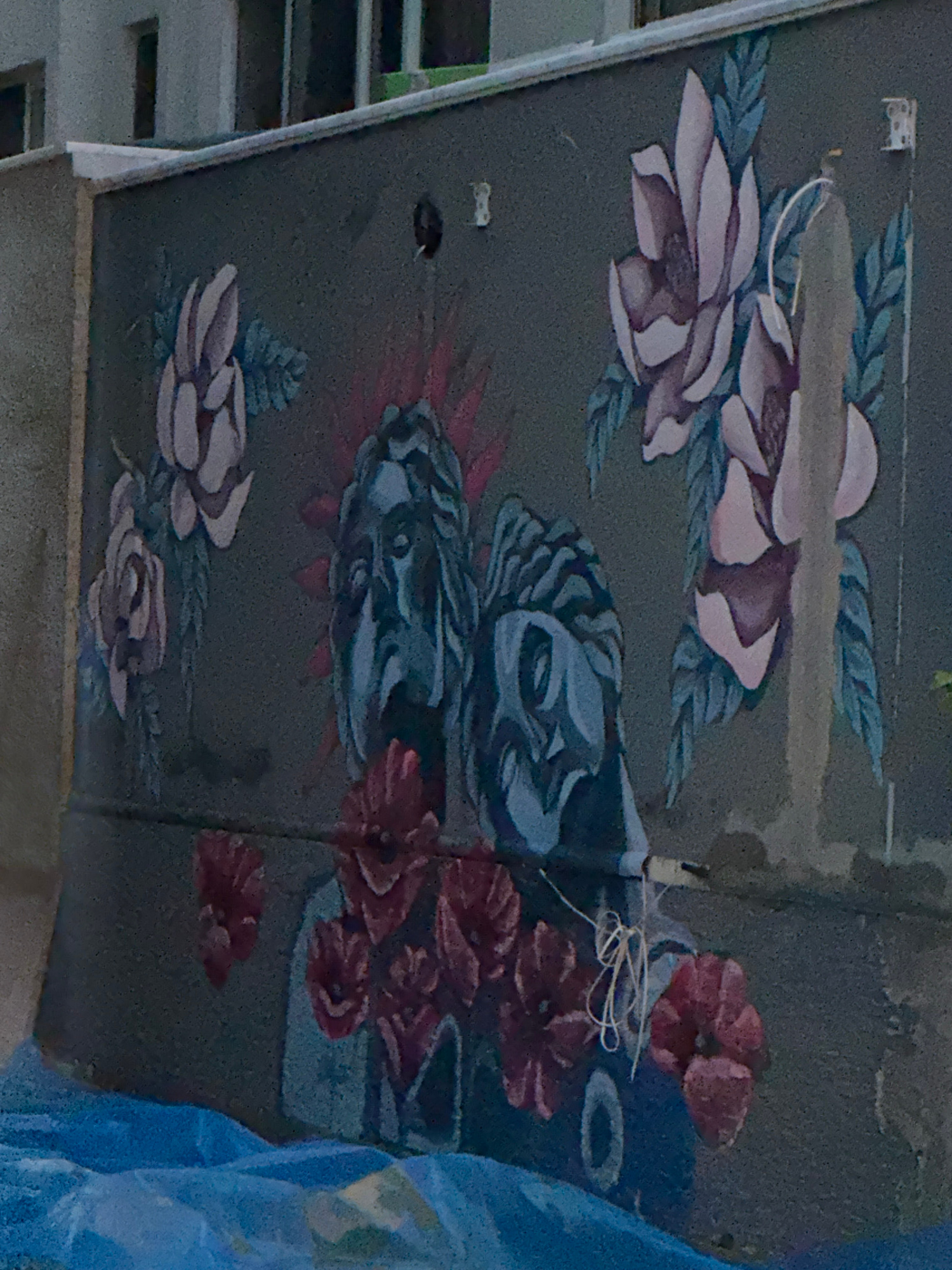 An angled view depicts a gray, textured wall with a mural painted on it. The mural features stylized floral designs and two stylized faces, one above the other. The flowers are rendered in shades of p…read more