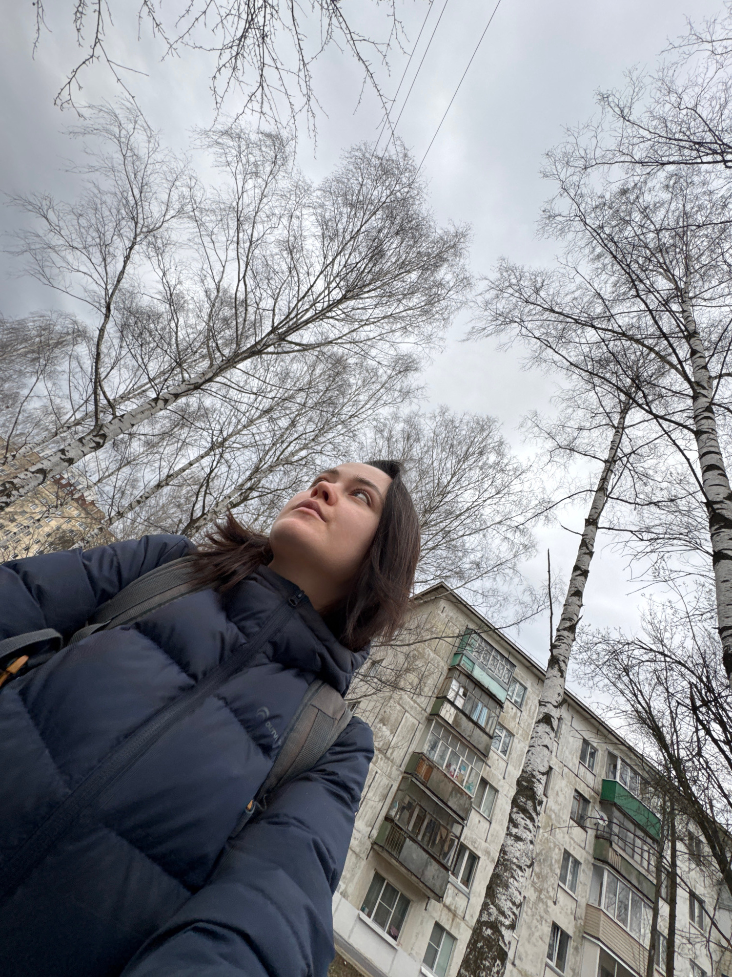 The image presents a low-angle, upward-looking perspective of a woman outdoors in an urban or suburban setting, likely Izhevsk, Russia. The woman, with dark hair, is seen from the chest up, looking in…read more