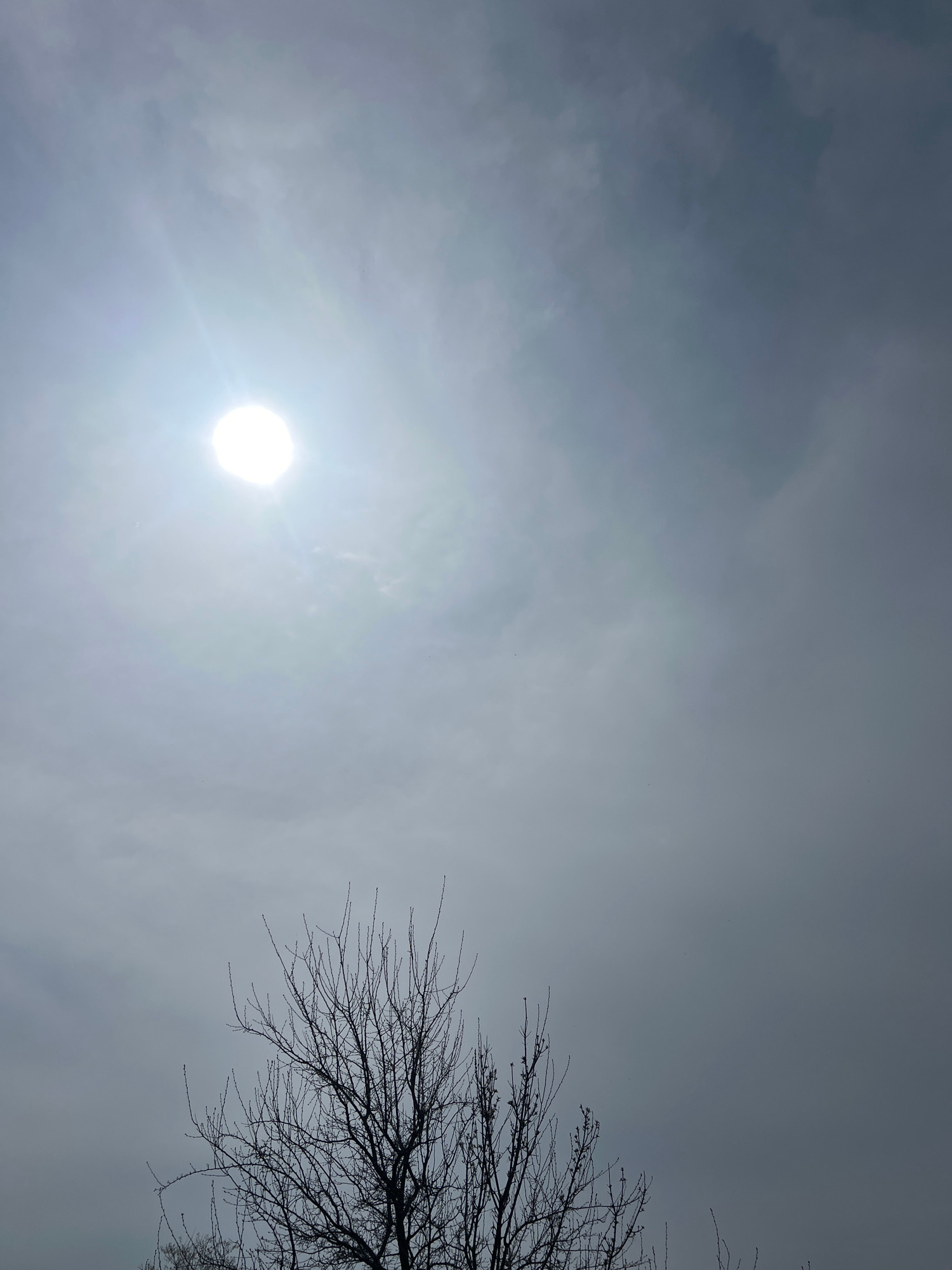 The image shows a daytime sky in Yambol, Bulgaria. The sky is overcast with a pale, almost white color. A bright, diffuse light source, presumably the sun, is visible in the lower left quadrant. In thβ¦read more