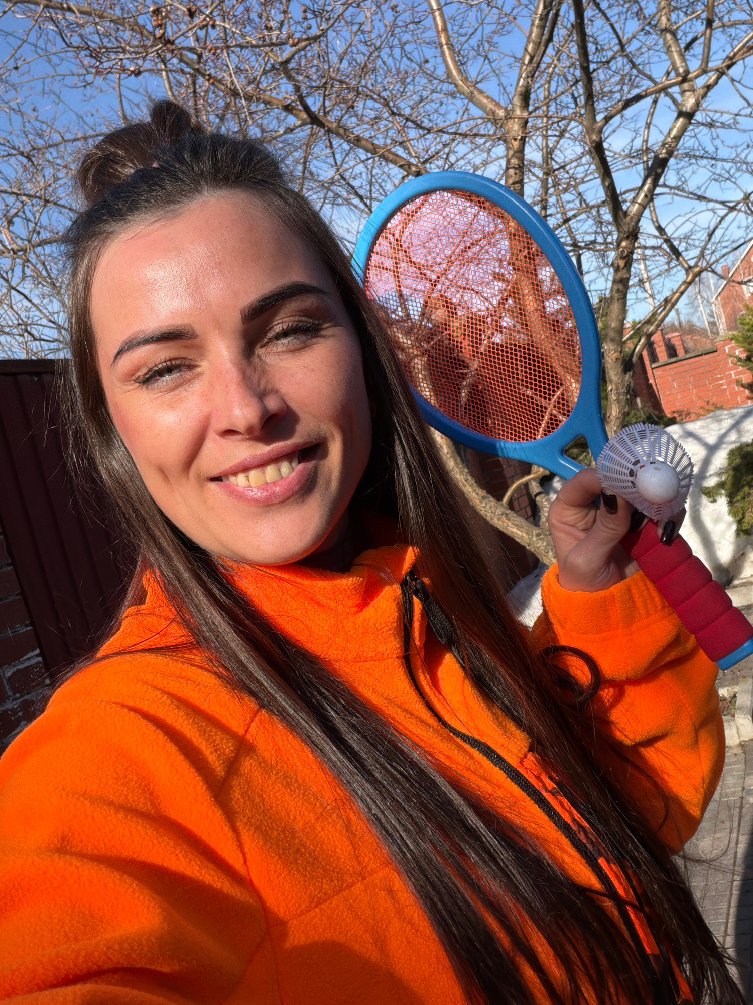 An outdoor selfie captures a single female subject in the city of Ферма, Russia, under clear blue skies with bright sunlight. The subject, an adult with long dark brown hair, some tied in a bun, is sm…read more