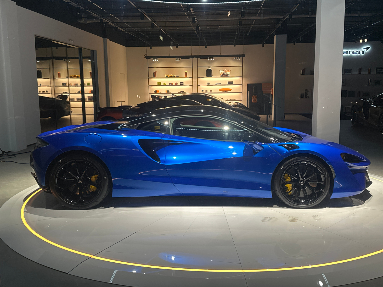 The image shows a blue McLaren Artura exhibited on a circular platform with a yellow LED border. The car is positioned inside a showroom; other cars and retail displays are visible in the background.…read more