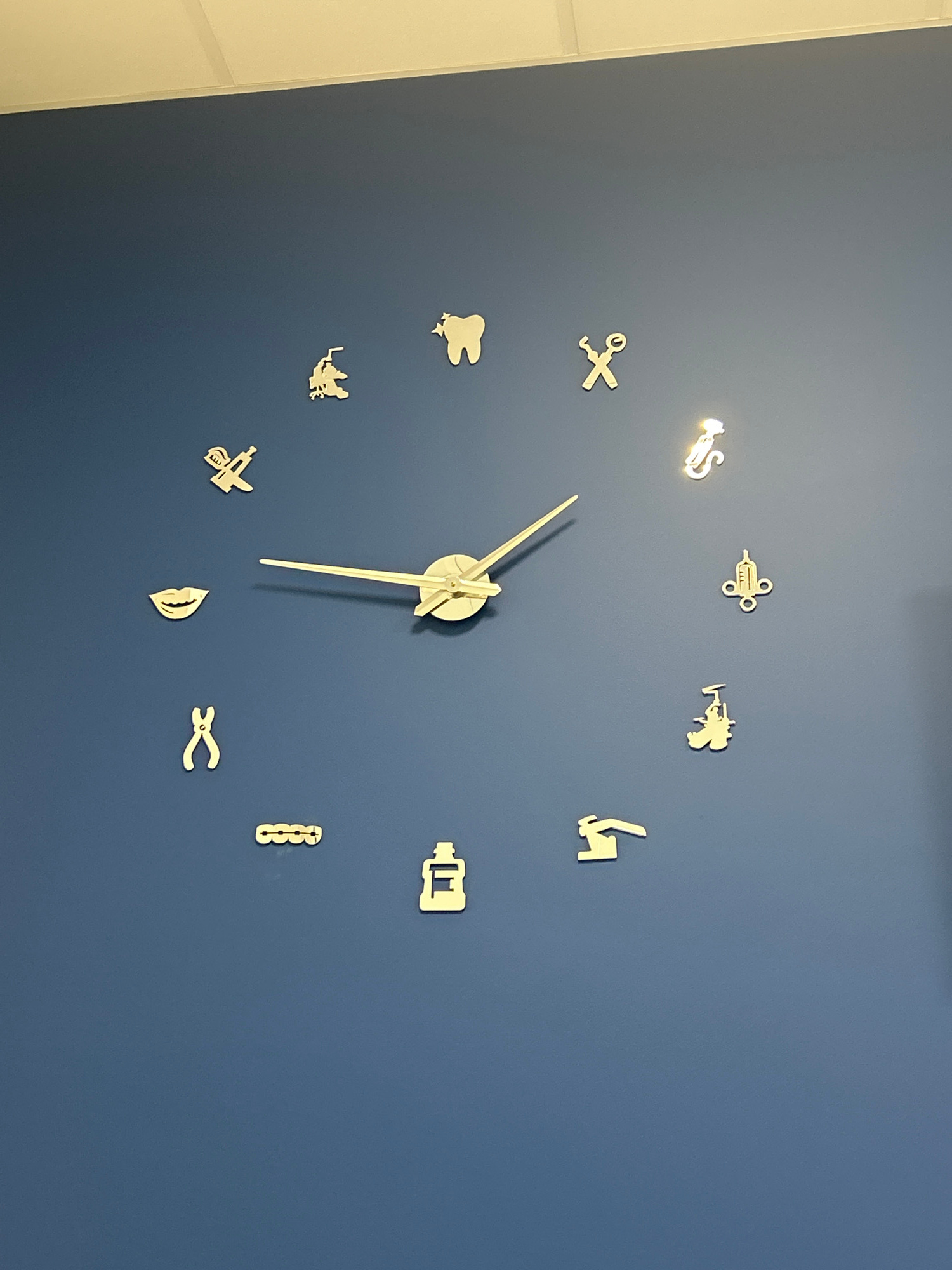 The image shows a wall clock on a blue wall. The clock face is represented by various dental tools or symbols placed where numbers would typically be. The time indicated by the clock's hands is approx…read more