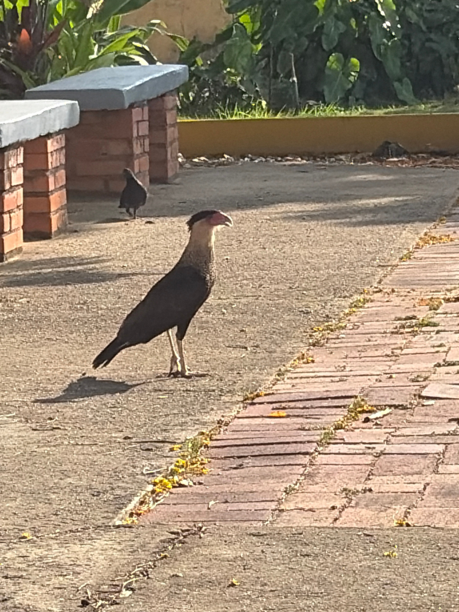 A crested caracara stands on a concrete surface next to a brick pathway in an urban environment. Another smaller, dark bird stands on the brick pathway near the caracara. Lush green foliage grows alon…read more