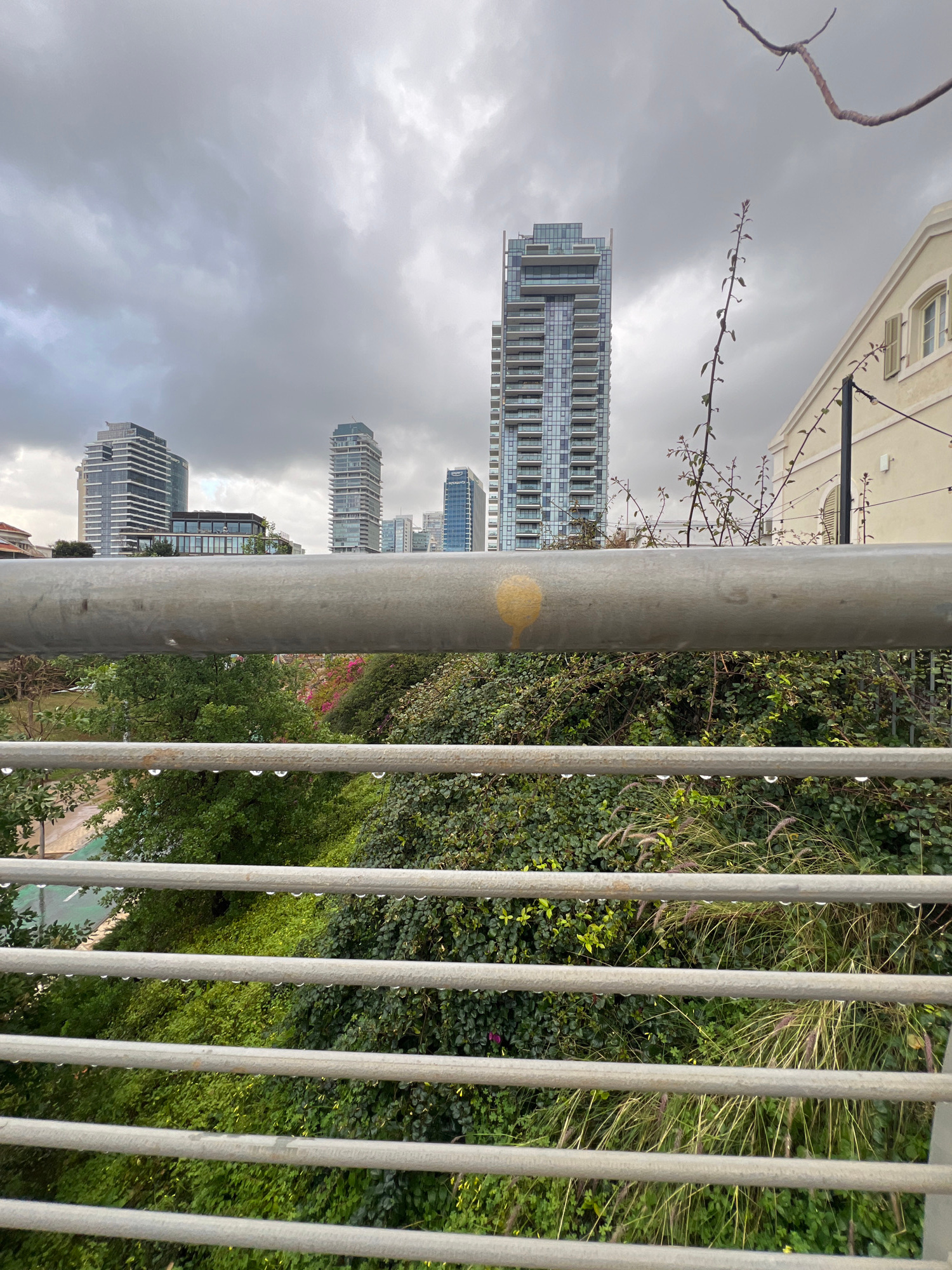 View from a pedestrian bridge in Tel Aviv, Israel. The perspective is from behind a silver metal fence and railing. Tall buildings are visible in the background against a cloudy sky. Green vegetation…read more