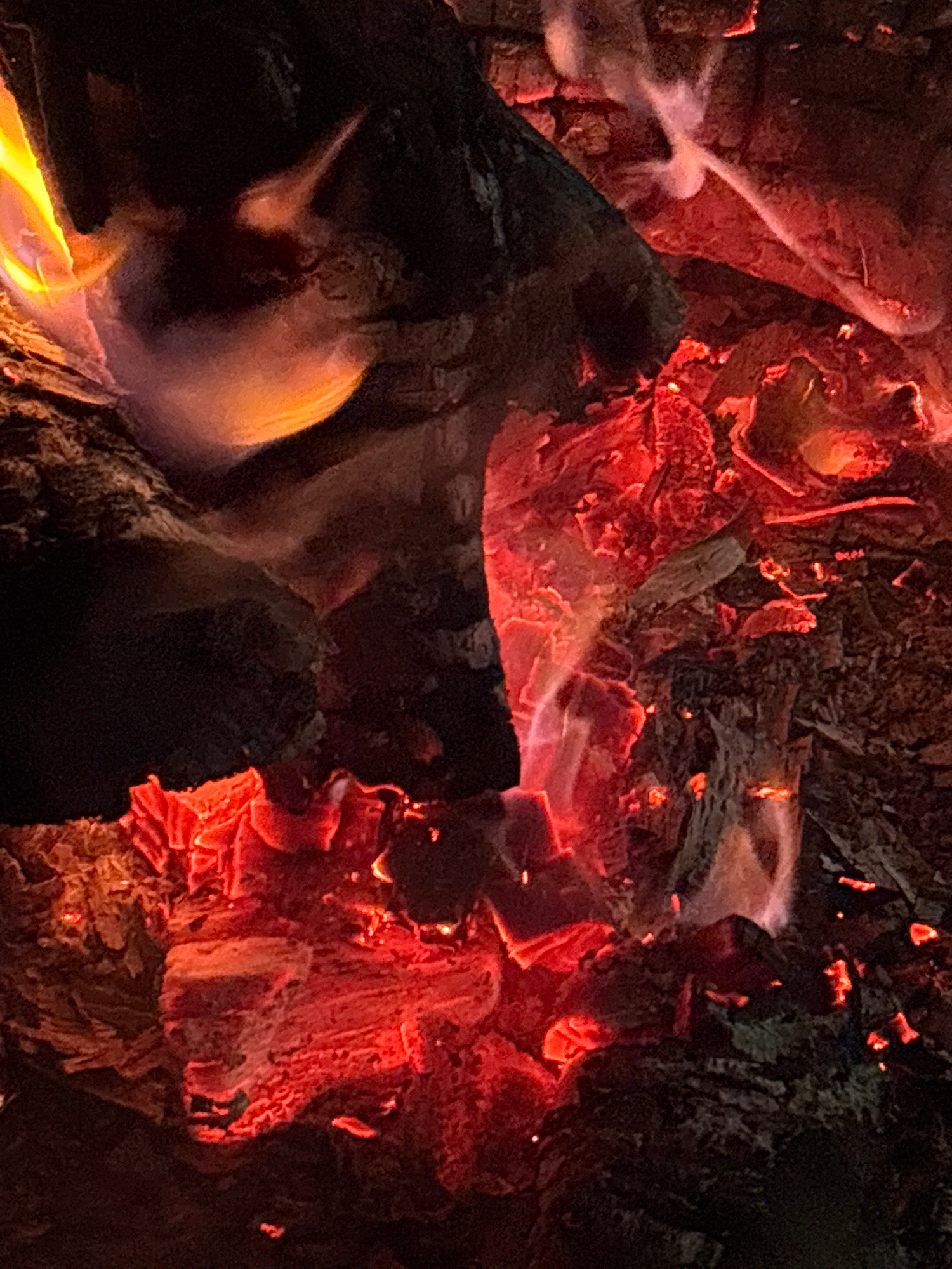 The image depicts a close-up view of burning embers and charred wood, resembling a dying campfire. The wood appears to be partially consumed by flames, emitting heat and light. Patches of bright orangβ¦read more