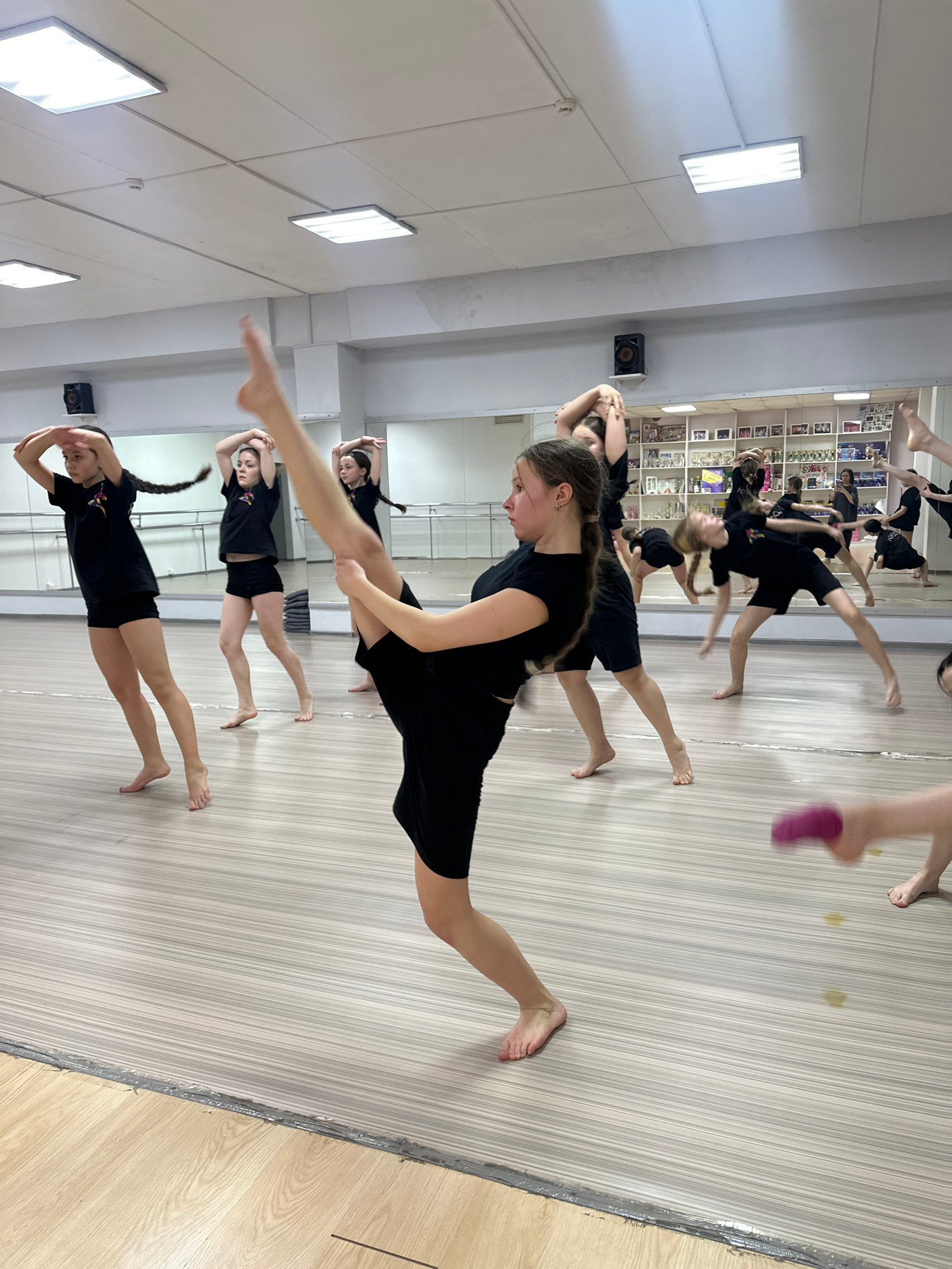 The image depicts a group of girls in a dance studio, likely located in a building in Votkinsk, Russia. The girls, dressed in black shorts and t-shirts, are barefoot and performing a dance routine. Th…read more