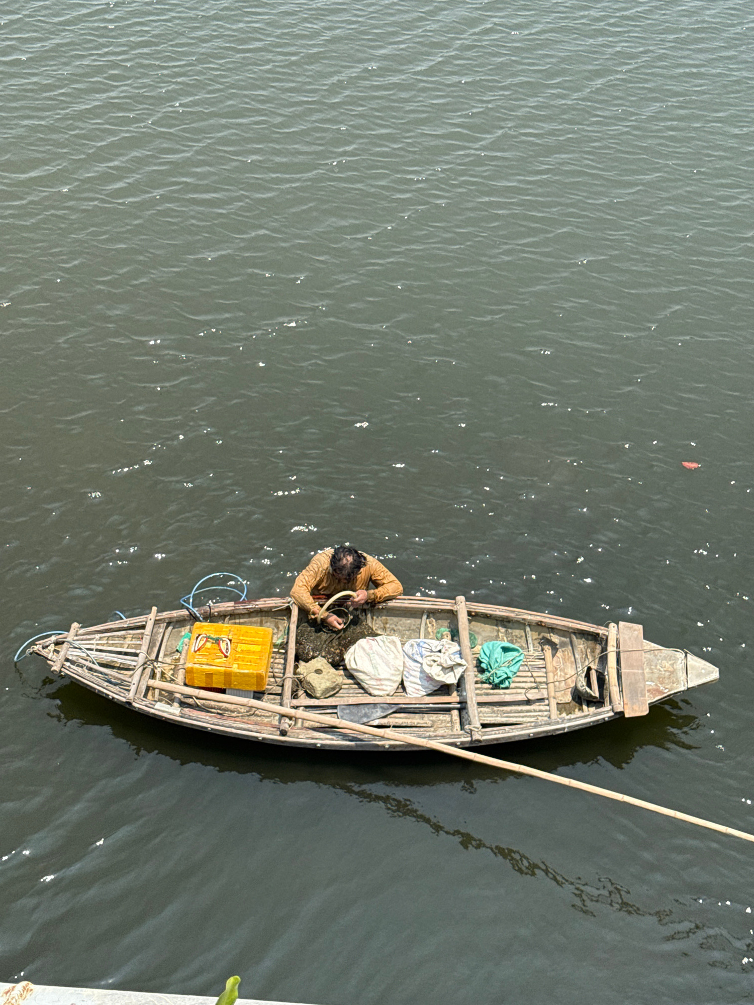 Captured from an elevated perspective, the image shows a narrow, wooden boat positioned on a body of water. Inside the boat, an individual is engaged in an activity that seems related to fishing, mana…read more