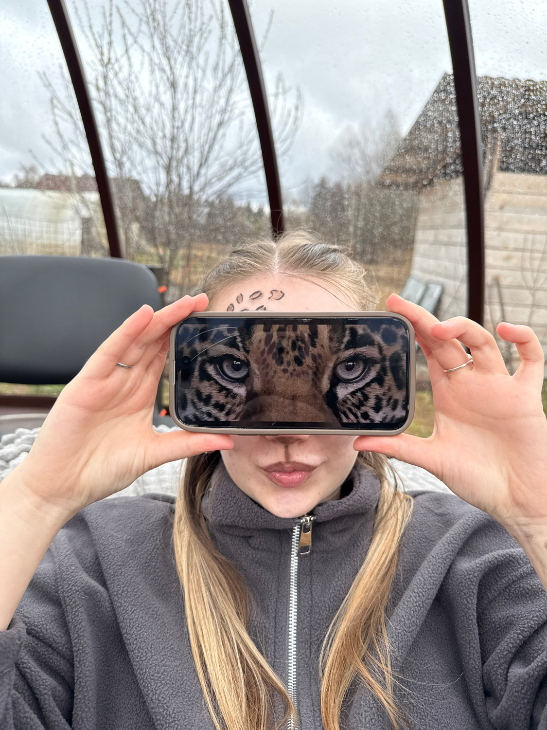 A young person, likely female, with long blonde hair, holds a smartphone directly in front of their face to create an optical illusion. They are wearing a grey zippered fleece jacket. The phone's scre…read more