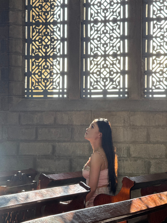 The image depicts the interior of Nha Trang Cathedral (Christ the King Cathedral) in Nha Trang, Vietnam. A lone female subject is seated in profile on a dark wooden pew positioned on the lower right s…read more