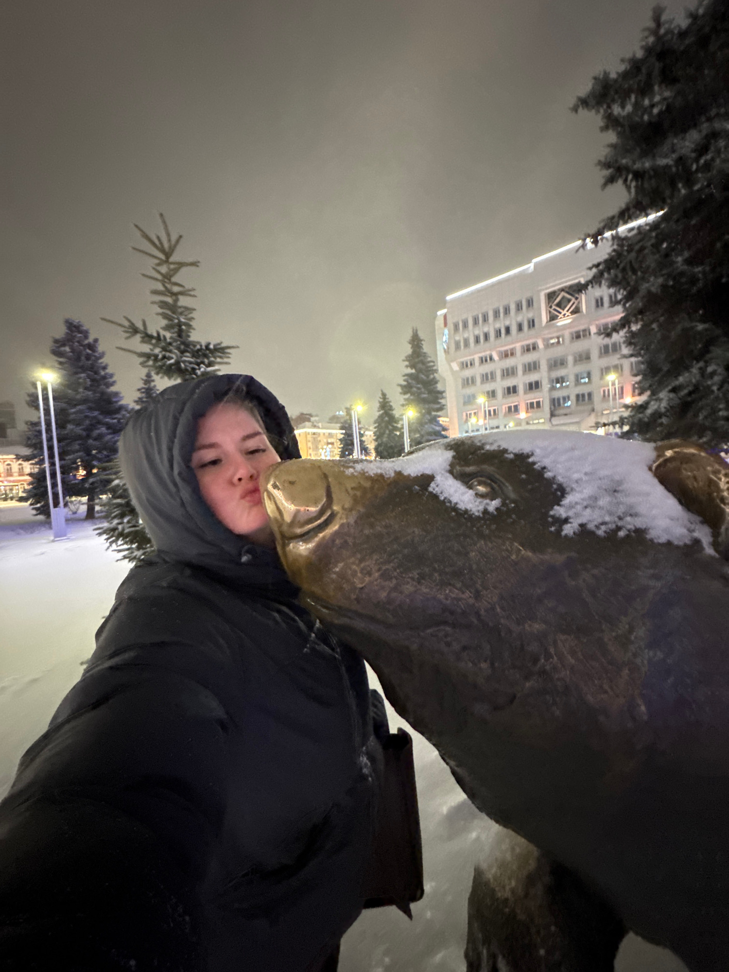 A young woman in a hooded jacket is positioned close to a bronze statue of a bear, pressing her lips to the bear's nose. The statue has snow on it. In the background, there is a building and some tree…read more