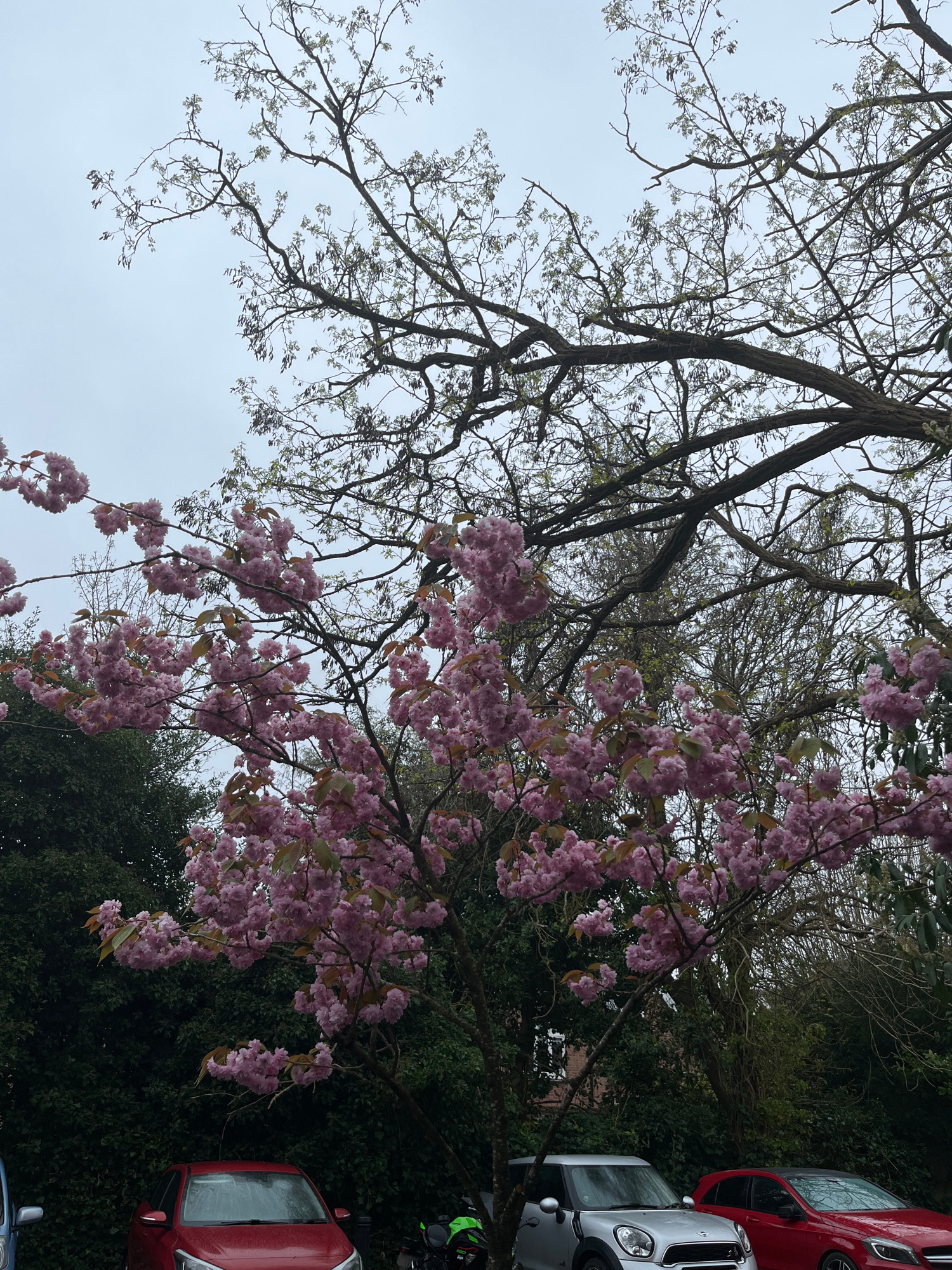 The image captures a scene in Tunbridge Wells, United Kingdom, featuring a mature tree with prominent branches, some adorned with clusters of pink blossoms. The sky is overcast. In the background, par…read more