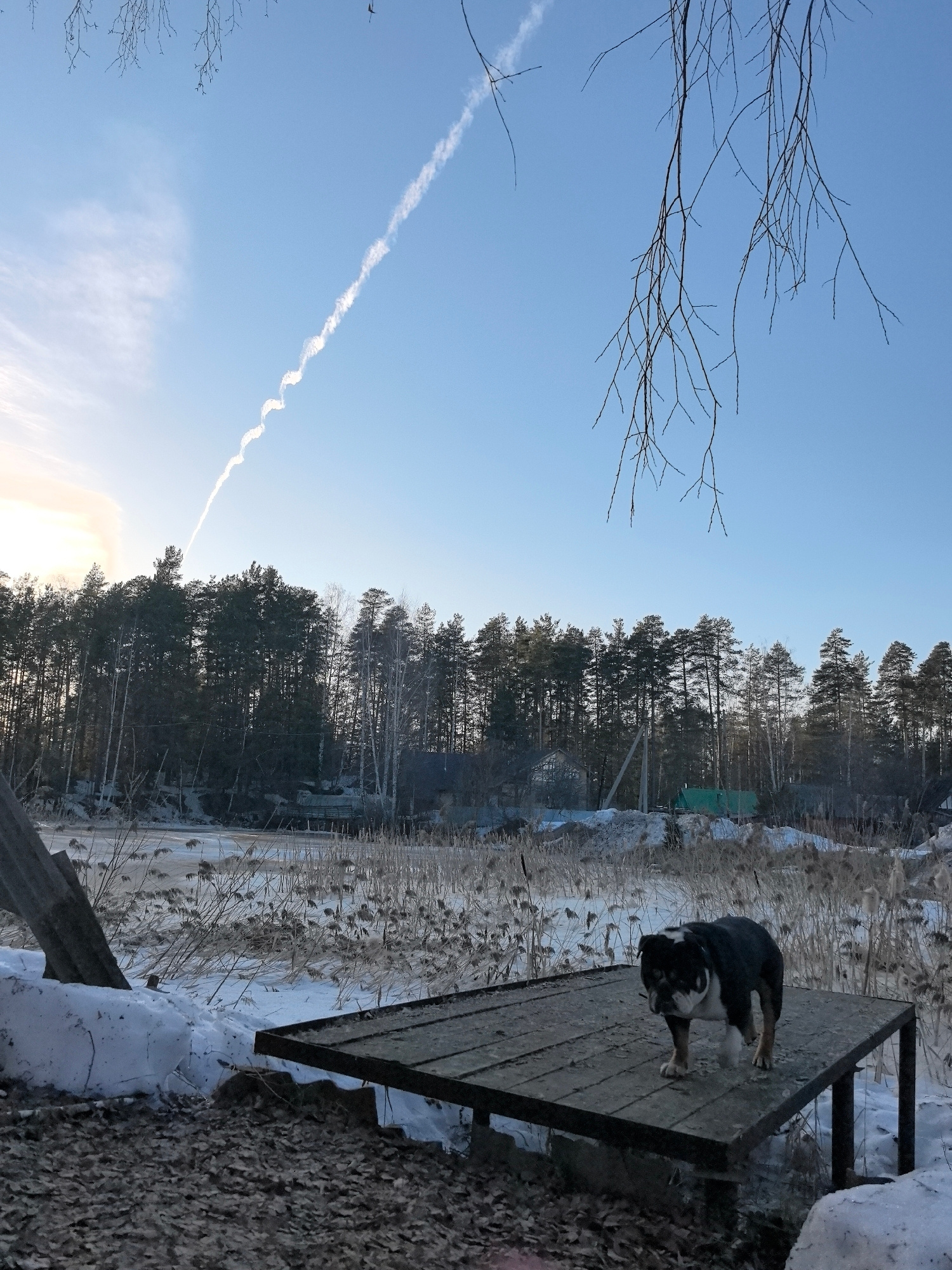 The image shows an outdoor scene in the city of Noviy, Russia, likely during winter. A black and white bulldog stands on a small, square, wooden platform. The platform is partially covered in frost or…read more