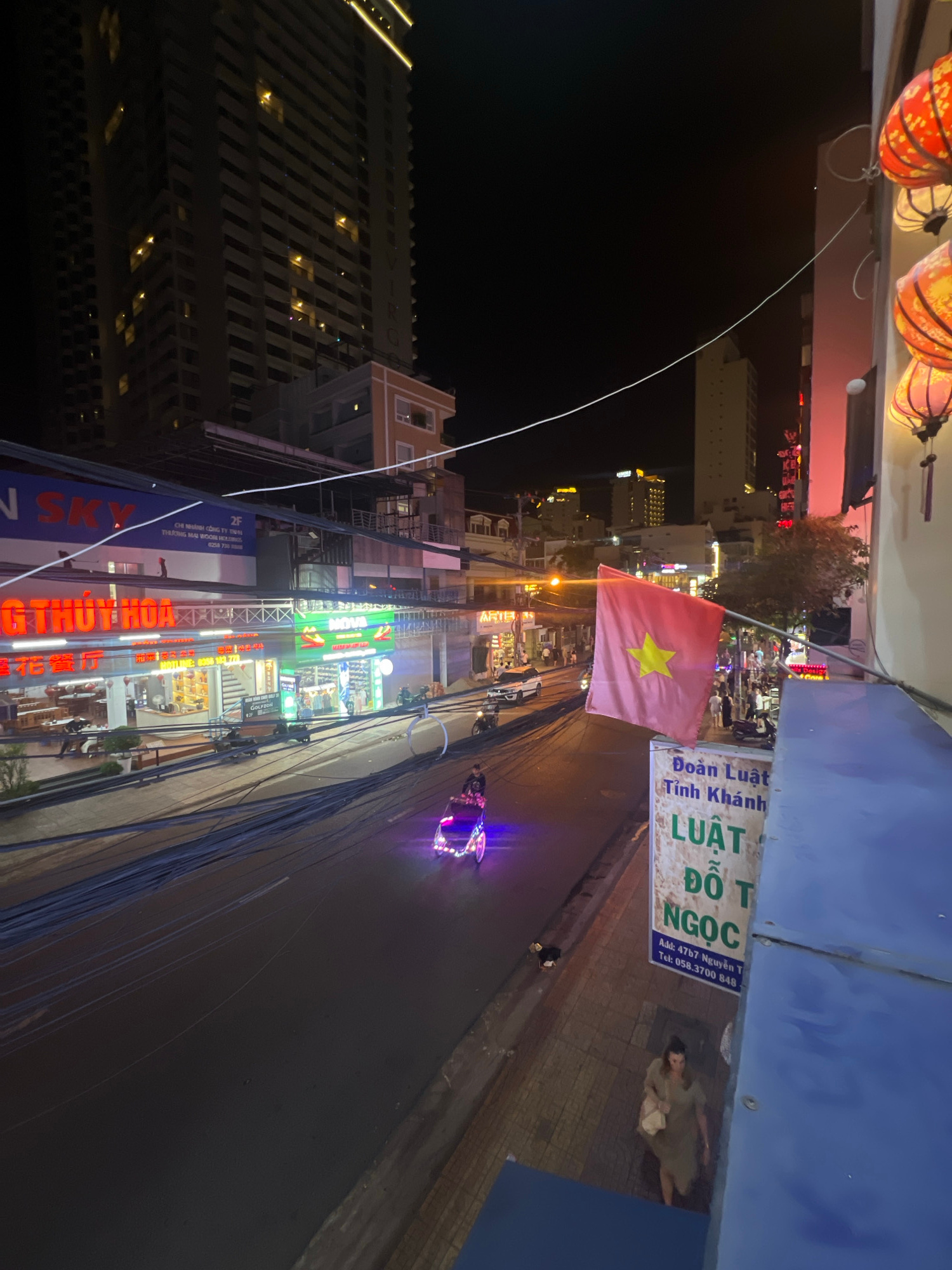 The image, taken at night in Nha Trang, Vietnam, shows a street scene from an elevated perspective. A Vietnamese flag is prominently displayed along with a sign for a law firm: "Đoàn Luật Tỉnh Khánh L…read more