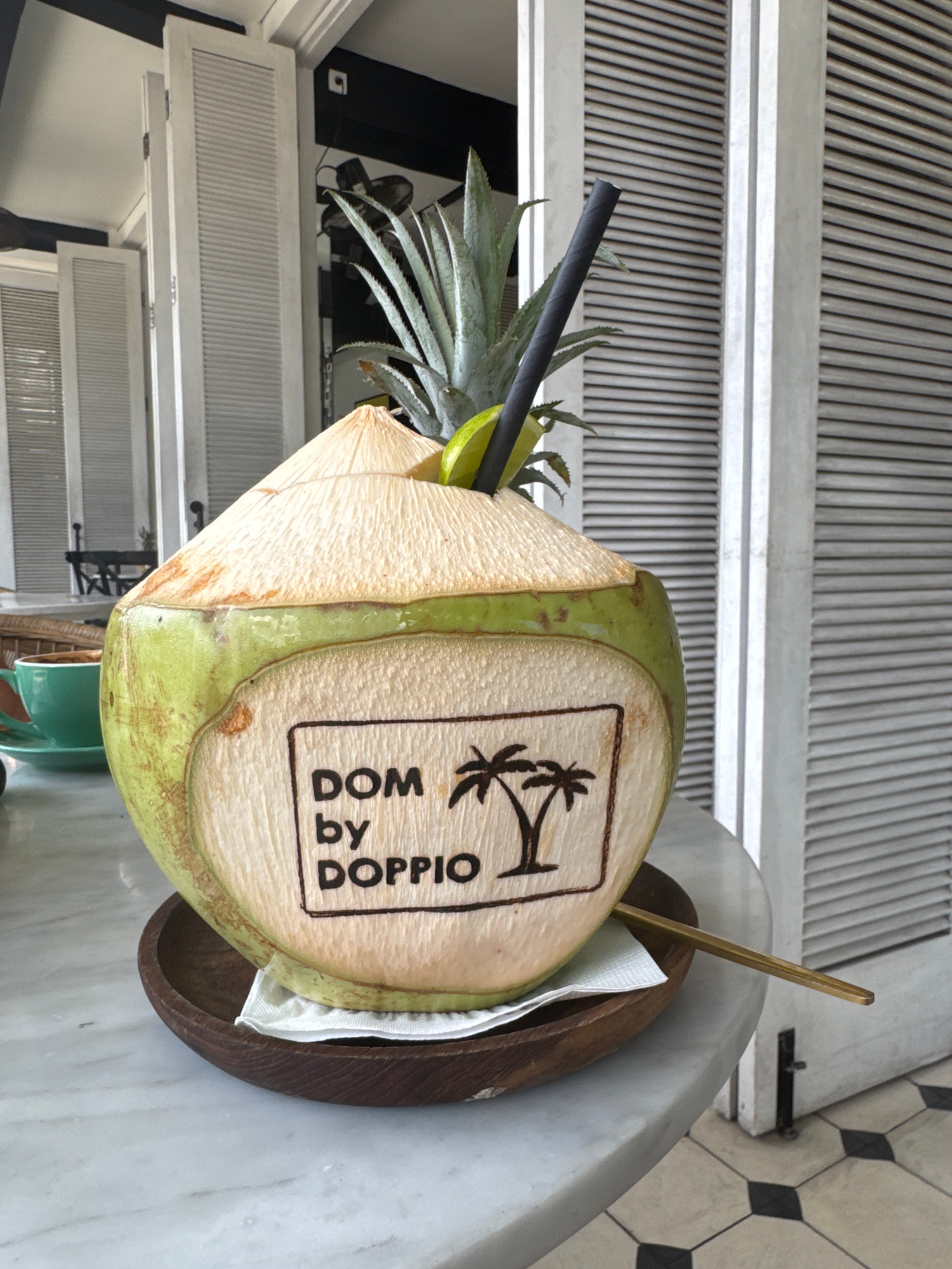 The image shows a coconut drink served at Dom by Doppio, a business located in North Kuta, Indonesia. The coconut has a black straw, a slice of lime, and pineapple leaves sticking out of it. The name…read more