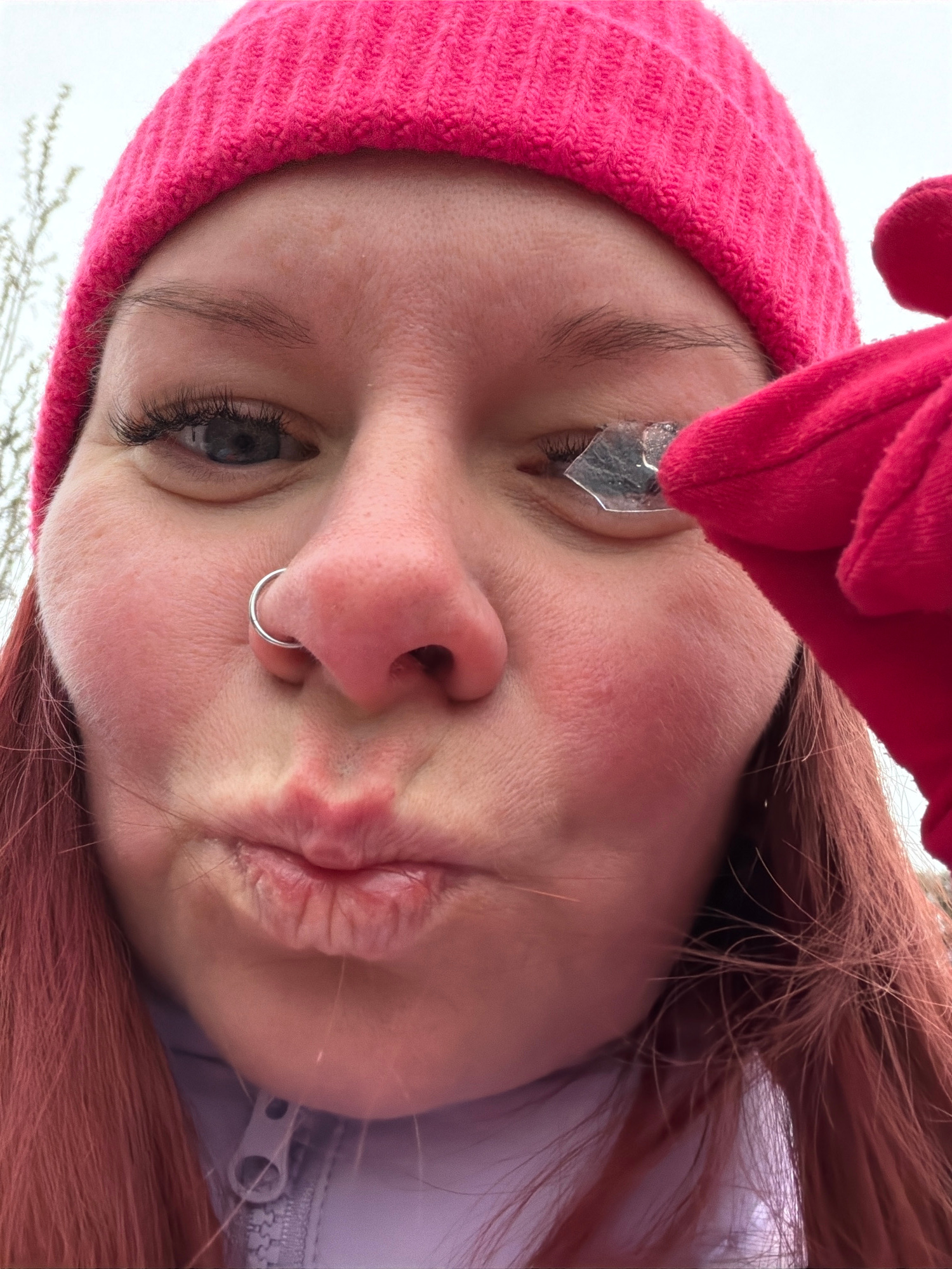 A close-up, upside-down portrait shows a person with fair skin wearing a pink knit hat and holding a small, shard-like object near their right eye. The person has red hair and is wearing a silver nose…read more