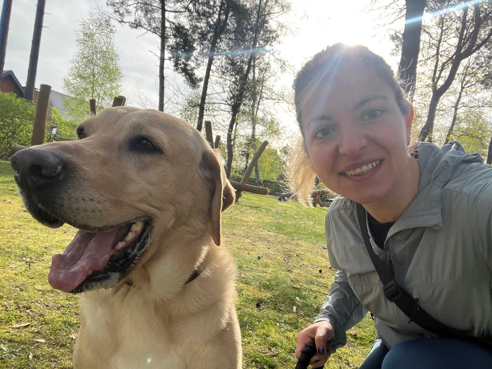 A woman and a Labrador Retriever are posing for a selfie in a grassy park in the Borough of Runnymede, United Kingdom. The woman is on the right, smiling at the camera, and wearing a light gray jacket…read more