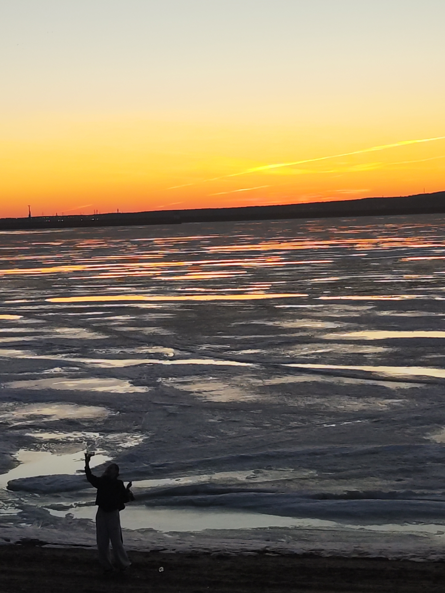 A vertical, eye-level shot captures a figure standing on a shoreline, silhouetted against a backdrop of a partially frozen body of water under a vibrant sunset. The upper portion of the image is domin…read more