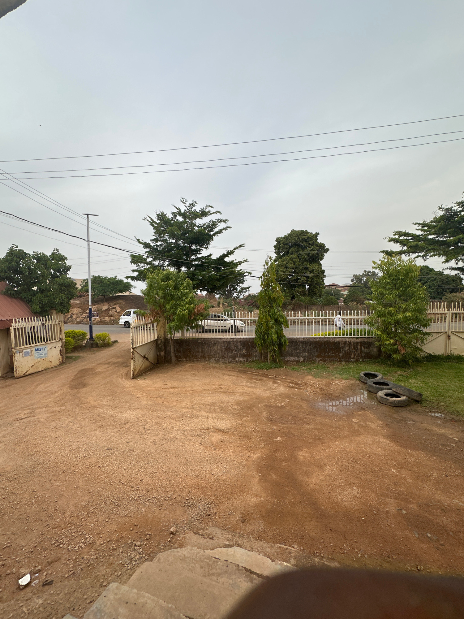 The image, correctly oriented, displays an outdoor scene featuring a reddish-brown dirt and gravel ground in the foreground, possibly a driveway or open area. Scattered wet patches on the ground sugge…read more