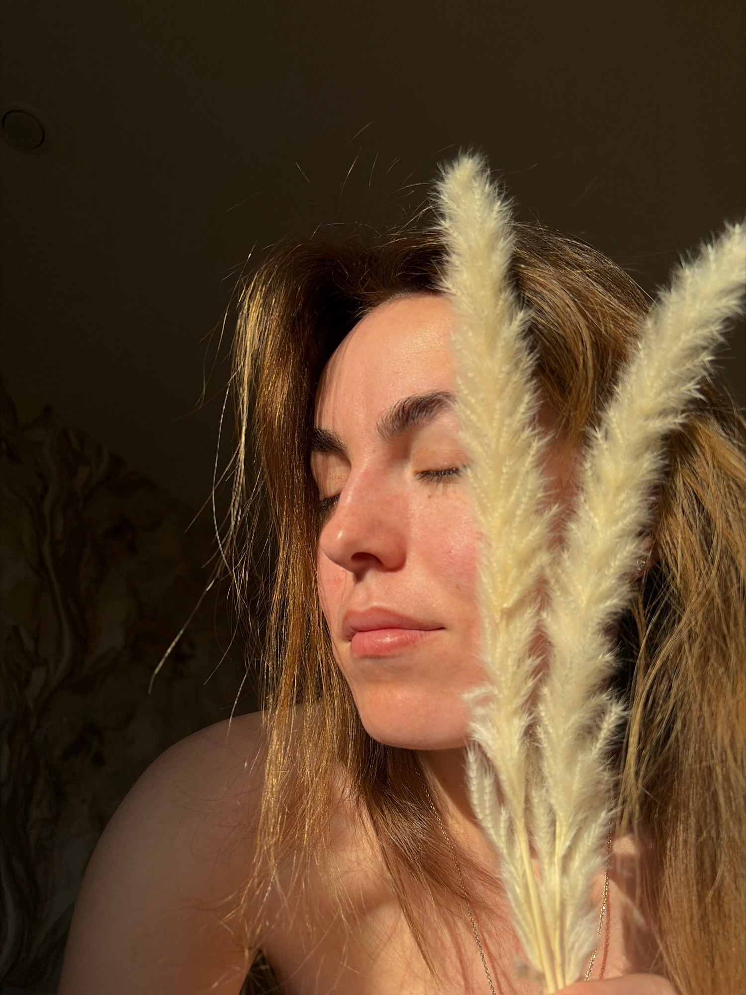 A close-up, rotated, side-view image presents a person with closed eyes, partly obscured by two sprigs of wheat-like grass held in front of their face. The person has light skin, with brown hair. They…read more