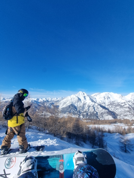 The image displays a snowy mountain landscape under a clear blue sky, situated in the area of Cesana Torinese, Italy. In the immediate foreground, the perspective is from a person's point of view, sho…read more