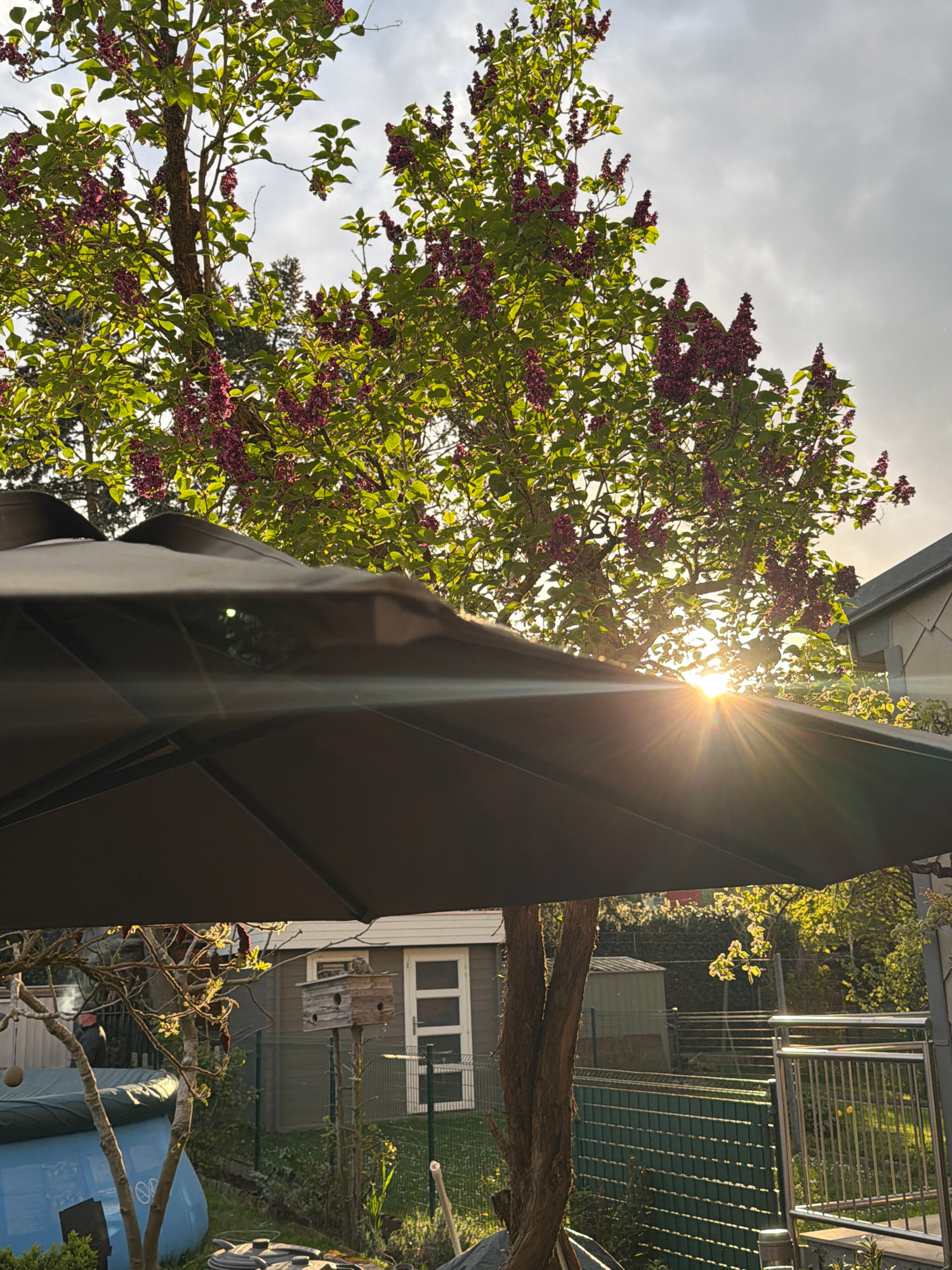 The image depicts an outdoor scene in Esch-sur-Alzette, Luxembourg, featuring a garden with various elements. A large, dark-colored patio umbrella dominates the foreground, partially obscuring the vie…read more