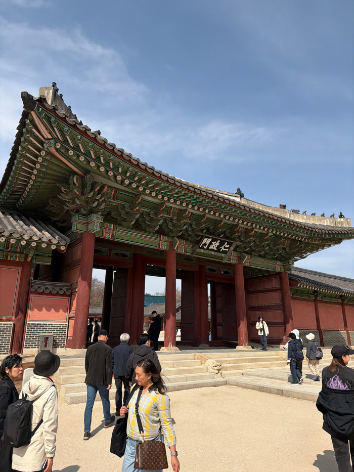 The image displays a wide shot of the Injeongmun Gate at Changdeokgung Palace, located in Seoul, South Korea, under a bright blue sky with scattered wispy clouds. The prominent structure is a large, t…read more