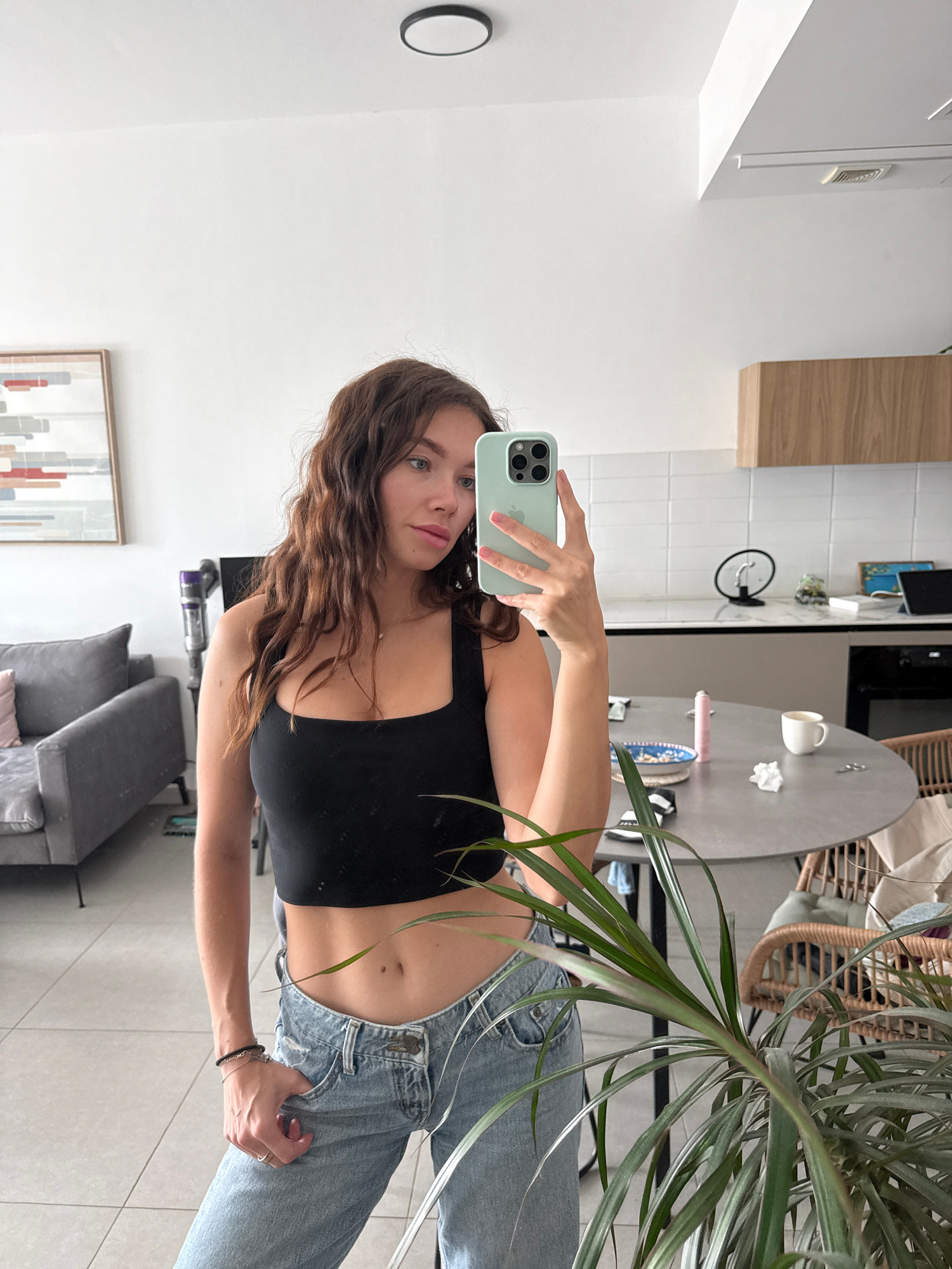 A young woman is captured in a mirror selfie inside a modern apartment, likely in Ramat Gan, Israel. The image is oriented vertically, appearing rotated counter-clockwise. She has long, wavy brown hai…read more