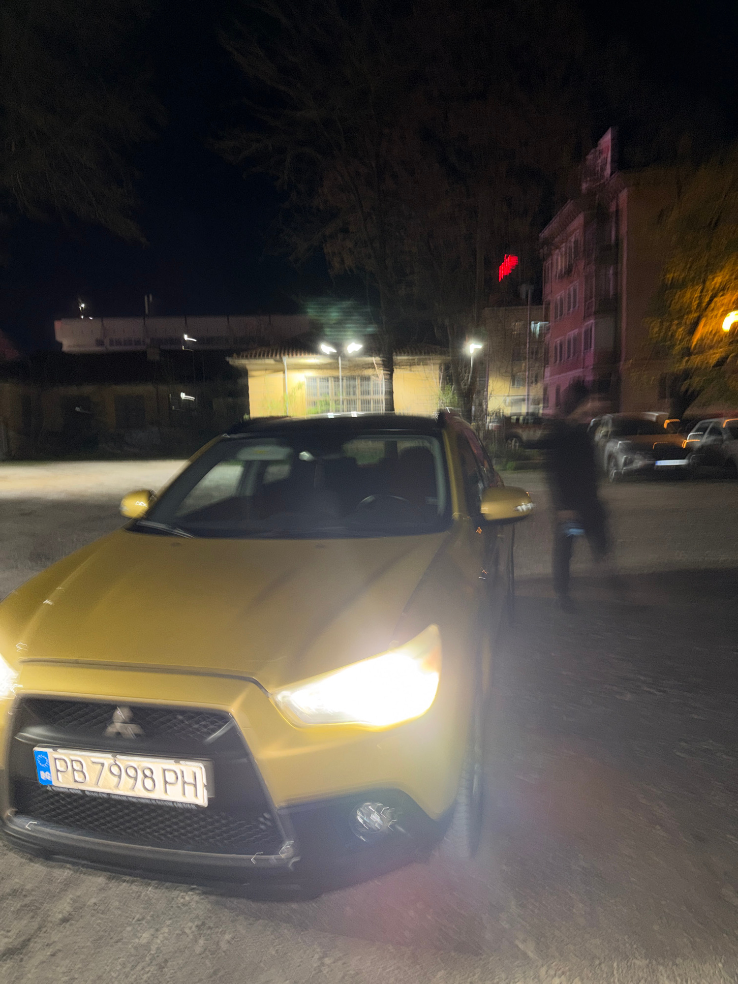 The image shows a gold Suzuki Swift parked on a street in Plovdiv, Bulgaria, at night. The car has a Bulgarian license plate "PB 7998 PH." The street is illuminated by streetlights. Buildings and tree…read more