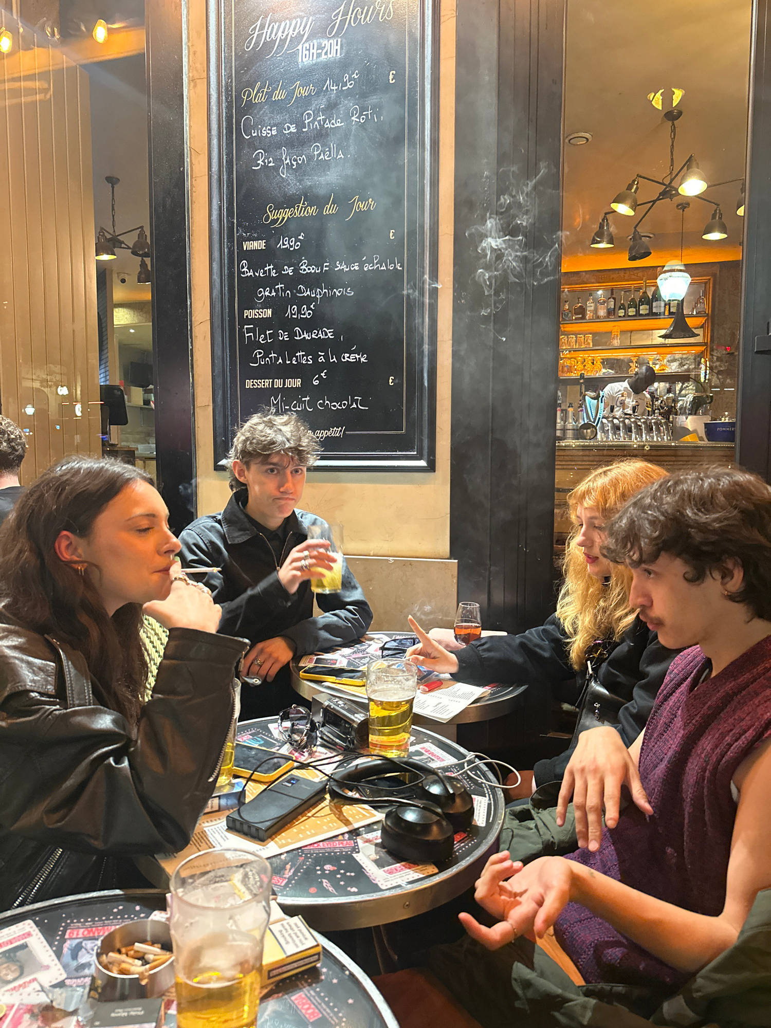 The image depicts a group of people sitting at tables outside a bistro, likely in Paris, France. The scene features a chalkboard menu in the background, displaying "Happy Hours" and "Suggestion du Jou…read more