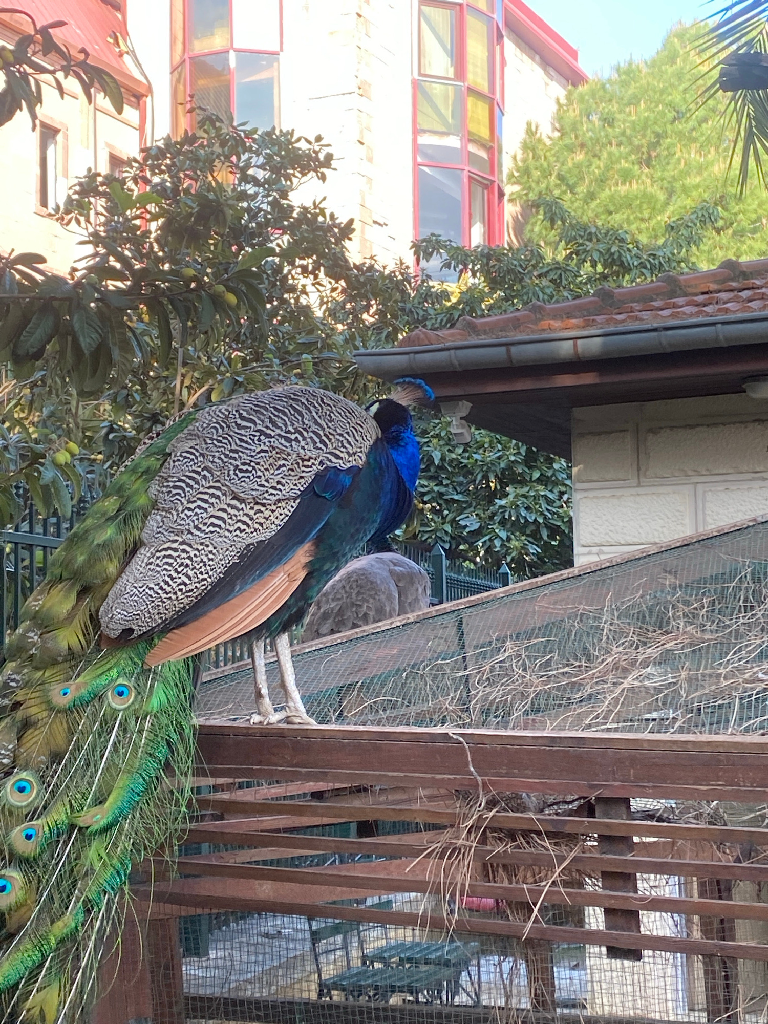 A male peacock sits on a perch near a cage with its tail flowing. The bird displays iridescent green, blue, and bronze colors in its plumage. Behind the peacock are trees, a building with stained glasβ¦read more
