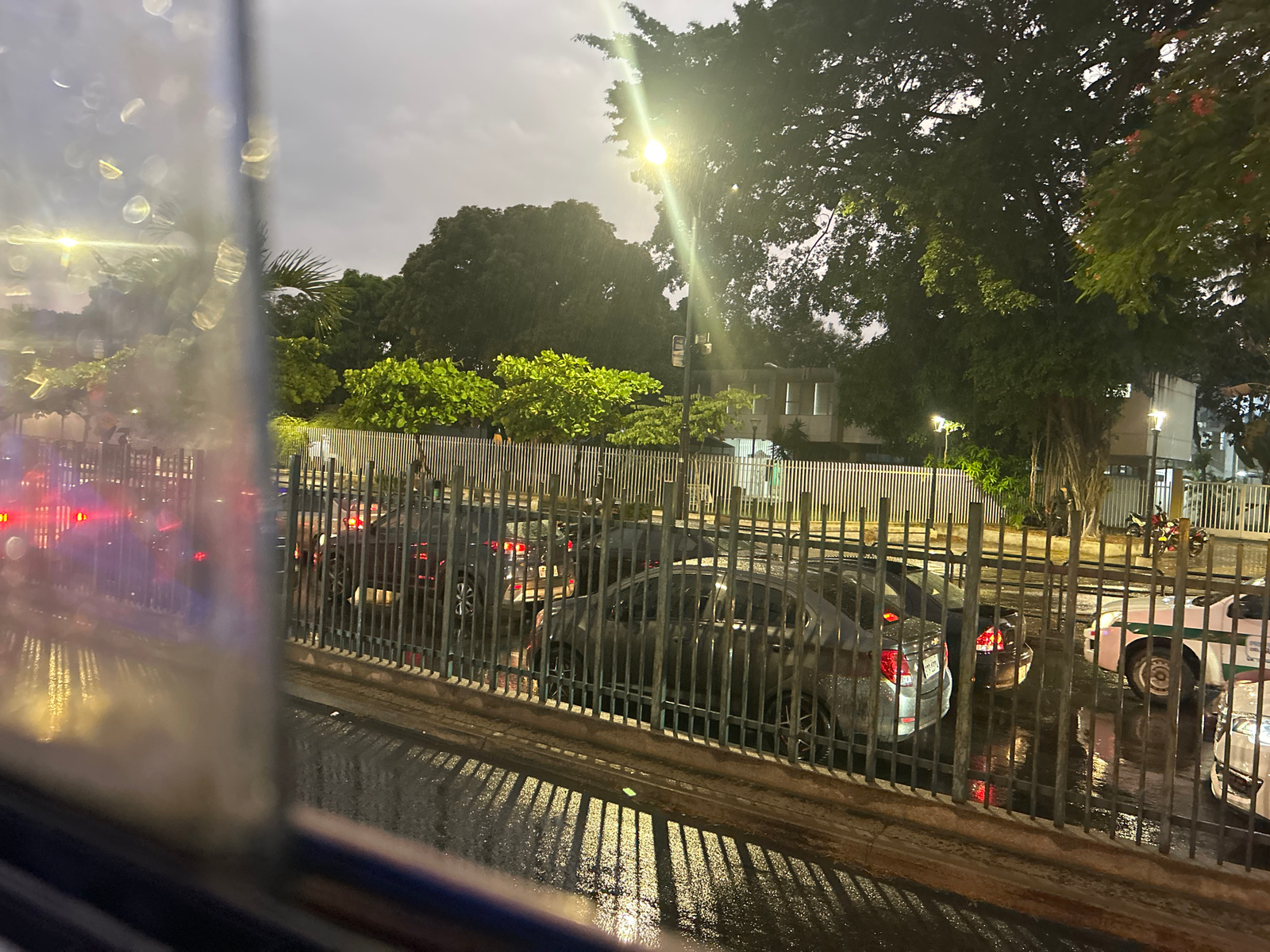 The image shows a nighttime street scene in Guayaquil, Ecuador, viewed through a rain-streaked window or barrier. Cars are parked along the street, visible through a metal grate. The background includβ¦read more