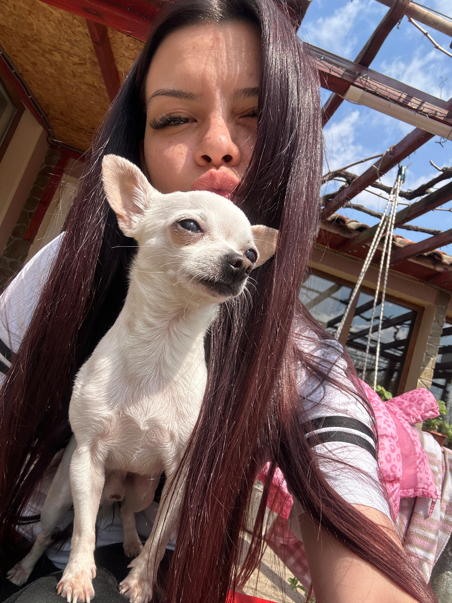 A woman is holding a small, white Chihuahua dog. The woman is fair-skinned with dark brown hair, eyelashes, and a pouting expression. She is wearing a white t-shirt with three black stripes on the sle…read more
