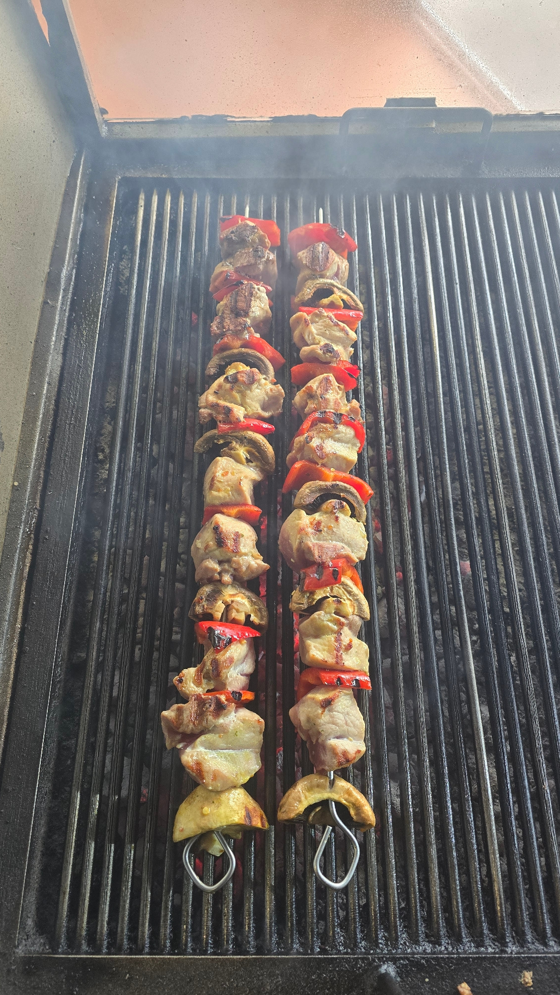 Two skewers of grilled food are positioned horizontally across a grill inside what appears to be an oven or smoker. The skewers contain a mix of meat, red bell peppers, and mushrooms, with some pieces…read more