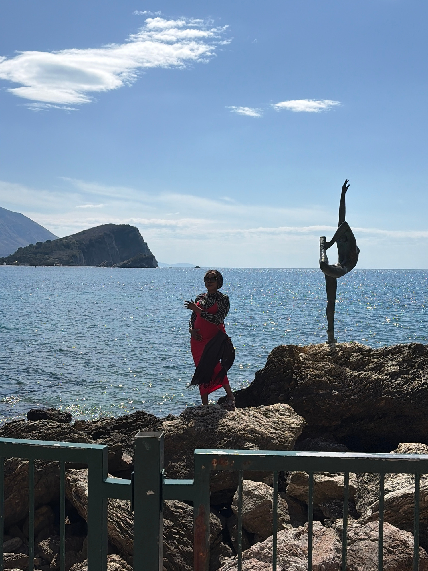 The image shows a coastline on a sunny day. The statue of a male figure doing yoga sits on a rocky outcrop overlooking the sea. A woman in a red dress stands on the rocks near a metal railing. In the…read more