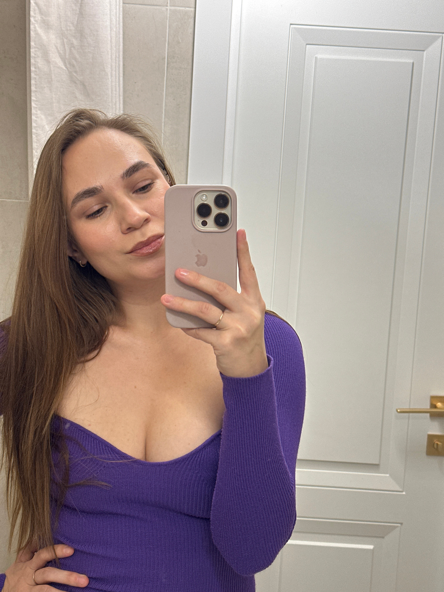 A woman with brown hair is taking a selfie in a bathroom. She is wearing a purple, low-cut sweater. She is holding a light purple iPhone in her right hand to take the photo. Behind her is a white door…read more