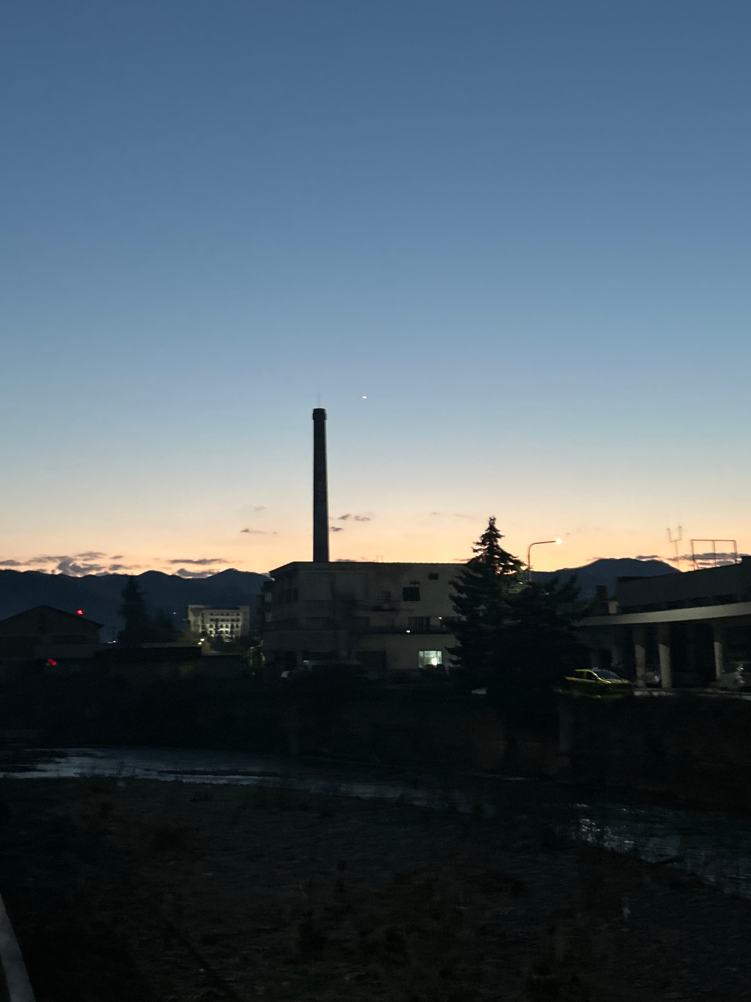 The image captures an evening scene in Zlatograd, Bulgaria, at dusk. A tall, dark smokestack stands prominently against the gradient of the sky, transitioning from a pale orange near the horizon to a…read more